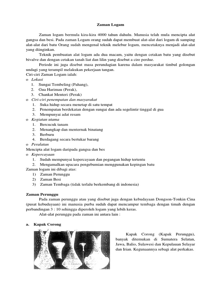 Manusia telah mula mencipta alat gangsa dan besi. Pada zaman Logam orang sudah dapat membuat alat-alat dari logam di samping alat-alat dari batu Orang sudah mengenal teknik melebur logam, mencetaknya menjadi alat-alat yang diinginkan. Teknik pembuatan alat logam ada dua macam, yaitu dengan cetakan batu yang disebut bivalve dan dengan cetakan tanah liat dan lilin yang disebut a cire perdue. Periode ini juga disebut masa perundagian karena dalam masyarakat timbul golongan undagi yang terampil melakukan pekerjaan tangan. Ciri-ciri Zaman Logam ialah: o Lokasi 1. Sungai Tembeling (Pahang), 2. Gua Harimau (Perak), 3. Chankat Menteri (Perak) o Ciri-ciri penempatan dan masyarakat 1. Suka hidup secara menetap di satu tempat 2. Penempatan berdekatan dengan sungai dan ada segelintir tinggal di gua 3. Mempunyai adat resam o Kegiatan utama 1. Bercucuk tanam 2. Menangkap dan menternak binatang 3. Berburu 4. Berdagang secara bertukar barang o Peralatan Mencipta alat logam daripada gangsa dan bes o Kepercayaan 1. Sudah mempunyai kepercayaan dan pegangan hidup tertentu 2. Mengamalkan upacara pengebumian menggunakan kepingan batu Zaman logam ini dibagi atas: 1) Zaman Perunggu 2) Zaman Besi 3) Zaman Tembaga (tidak terlalu berkembang di indonesia) Zaman Perunggu Pada zaman perunggu atau yang disebut juga dengan kebudayaan Dongson-Tonkin Cina (pusat kebudayaan) ini manusia purba sudah dapat mencampur tembaga dengan timah dengan perbandingan 3 : 10 sehingga diperoleh logam yang lebih keras. Alat-alat perunggu pada zaman ini antara lain : a. Kapak Corong Kapak Corong (Kapak Perunggu), banyak ditemukan di Sumatera Selatan, Jawa, Balio, Sulawesi dan Kepulauan Selayar dan Irian. Kegunaannya sebagi alat perkakas.