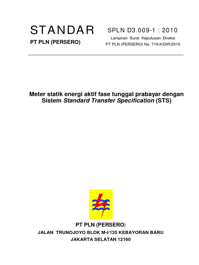 Kemajuan bidang elektronika, komunikasi dan piranti lunak saat ini membuat metode transaksi menjadi lebih mudah walaupun semakin kompleks permasalahannya, antara lain sistem prabayar dan perangkat pembayaran maupun penggunaan metode pengkodean (enkripsi). Mengingat banyaknya peralatan dan sistem prabayar transaksi energi listrik yang dikembangkan serta ditawarkan pada PLN, diperlukan suatu acuan dasar untuk pemilihan dan pengujian masing-masing jenis sistem prabayar kelistrikan yang akan diterapkan. Standar ini menetapkan persyaratan meter energi (kWh meter) dengan menggunakan sistem prabayar Standard Transfer Specification (STS) komunikasi satu arah dengan tarif flat sebagai acuan spesifikasi bagi unit-unit PLN. Untuk persyaratan sistem pengelolaan prabayar STS skala besar, kompleks dan handal akan ditetapkan tersendiri. Standar ini merupakan pedoman umum dalam pembuatan spesifikasi teknis serta petunjuk teknis pemakaian untuk unit-unit PT PLN (Persero), dan ketentuan desain, pembuatan, pengujian untuk pabrikan, pemasok maupun lembaga penguji.