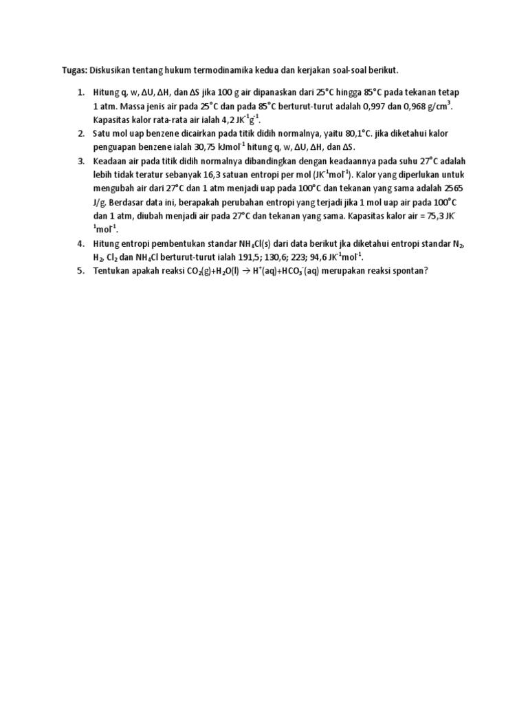 Hitung q, w, U, H, dan S jika 100 g air dipanaskan dari 25oC hingga 85oC pada tekanan tetap 1 atm. Massa jenis air pada 25oC dan pada 85oC berturut-turut adalah 0,997 dan 0,968 g/cm3. Kapasitas kalor rata-rata air ialah 4,2 JK-1g-1. 2. Satu mol uap benzene dicairkan pada titik didih normalnya, yaitu 80,1oC. jika diketahui kalor penguapan benzene ialah 30,75 kJmol-1 hitung q, w, U, H, dan S. 3. Keadaan air pada titik didih normalnya dibandingkan dengan keadaannya pada suhu 27oC adalah lebih tidak teratur sebanyak 16,3 satuan entropi per mol (JK-1mol-1). Kalor yang diperlukan untuk mengubah air dari 27oC dan 1 atm menjadi uap pada 100oC dan tekanan yang sama adalah 2565 J/g. Berdasar data ini, berapakah perubahan entropi yang terjadi jika 1 mol uap air pada 100oC dan 1 atm, diubah menjadi air pada 27oC dan tekanan yang sama. Kapasitas kalor air = 75,3 JK1 mol-1. 4. Hitung entropi pembentukan standar NH4Cl(s) dari data berikut jka diketahui entropi standar N2, H2, Cl2 dan NH4Cl berturut-turut ialah 191,5; 130,6; 223; 94,6 JK-1mol-1. 5. Tentukan apakah reaksi CO2(g)+H2O(l) H+(aq)+HCO3-(aq) merupakan reaksi spontan?