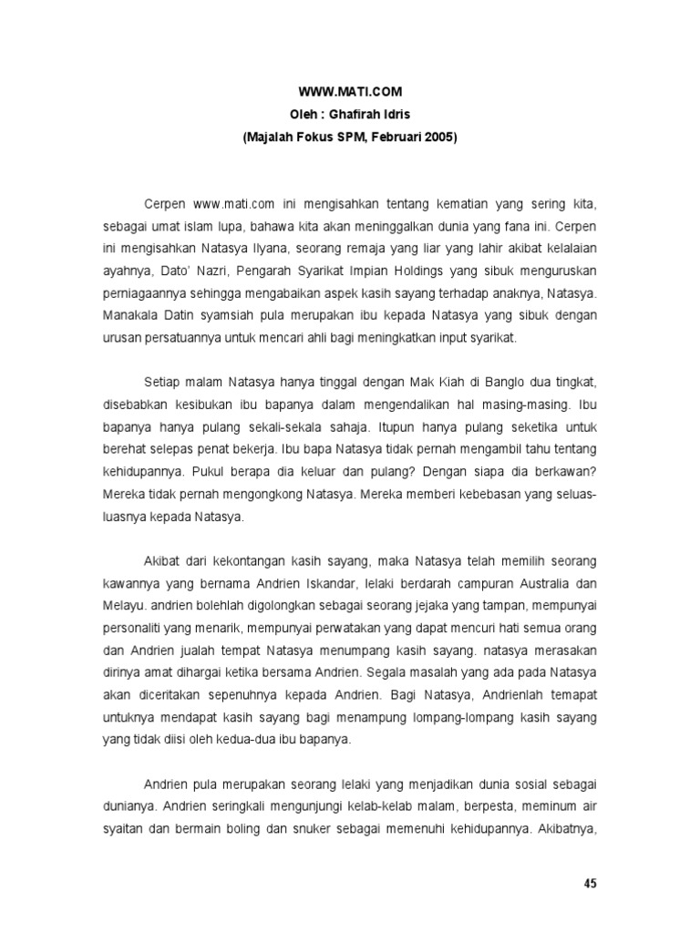 Cerpen www.mati.com ini mengisahkan tentang kematian yang sering kita, sebagai umat islam lupa, bahawa kita akan meninggalkan dunia yang fana ini. Cerpen ini mengisahkan Natasya Ilyana, seorang remaja yang liar yang lahir akibat kelalaian ayahnya, Dato Nazri, engarah !yarikat Impian "oldings yang sibuk menguruskan perniagaannya sehingga mengabaikan aspek kasih sayang terhadap anaknya, Natasya. #anakala Datin syamsiah pula merupakan ibu kepada Natasya yang sibuk dengan urusan persatuannya untuk mencari ahli bagi meningkatkan input syarikat. !etiap malam Natasya hanya tinggal dengan #ak $iah di %anglo dua tingkat, disebabkan kesibukan ibu bapanya dalam mengendalikan hal masing&masing. Ibu bapanya hanya pulang sekali&sekala sahaja. Itupun hanya pulang seketika untuk berehat selepas penat bekerja. Ibu bapa Natasya tidak pernah mengambil tahu tentang kehidupannya. ukul berapa dia keluar dan pulang' Dengan siapa dia berkawan' #ereka tidak pernah mengongkong Natasya. #ereka memberi kebebasan yang seluas& luasnya kepada Natasya. (kibat dari kekontangan kasih sayang, maka Natasya telah memilih seorang kawannya yang bernama (ndrien Iskandar, lelaki berdarah campuran (ustralia dan #elayu. andrien bolehlah digolongkan sebagai seorang jejaka yang tampan, mempunyai personaliti yang menarik, mempunyai perwatakan yang dapat mencuri hati semua orang dan (ndrien jualah tempat Natasya menumpang kasih sayang. natasya merasakan dirinya amat dihargai ketika bersama (ndrien. !egala masalah yang ada pada Natasya akan diceritakan sepenuhnya kepada (ndrien. %agi Natasya, (ndrienlah temapat untuknya mendapat kasih sayang bagi menampung lompang&lompang kasih sayang yang tidak diisi oleh kedua&dua ibu bapanya. (ndrien pula merupakan seorang lelaki yang menjadikan dunia sosial sebagai dunianya. (ndrien seringkali mengunjungi kelab&kelab malam, berpesta, meminum air syaitan dan bermain boling dan snuker sebagai memenuhi kehidupannya. (kibatnya,