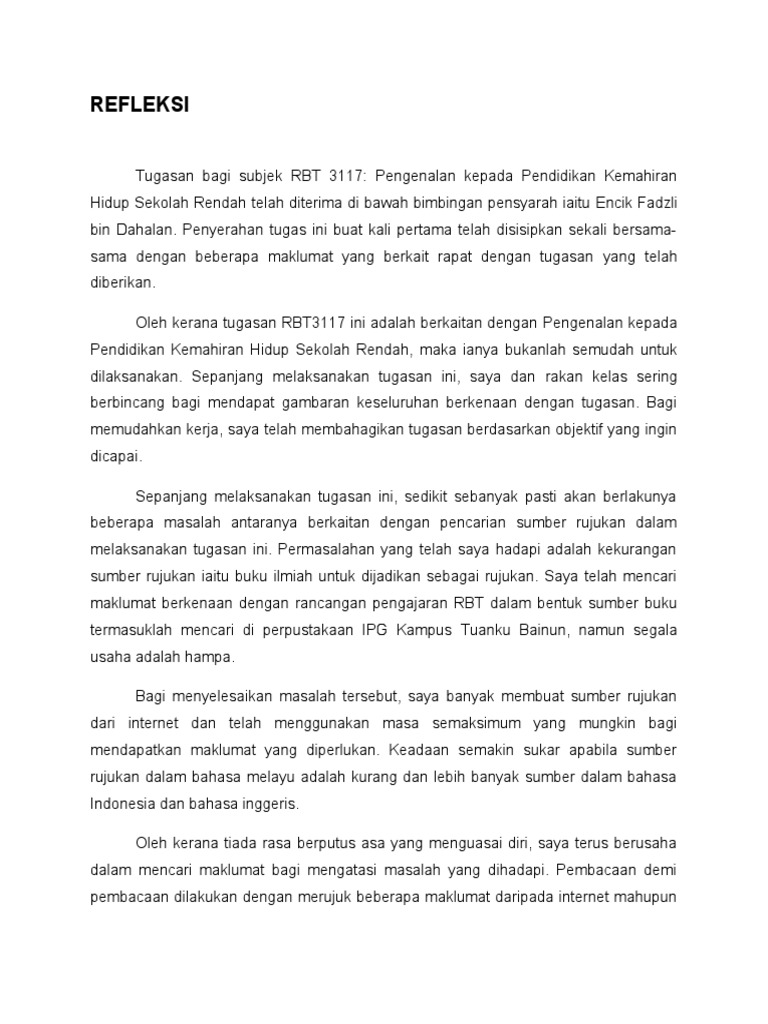 Tugasan bagi subjek RBT 3117: Pengenalan kepada Pendidikan Kemahiran Hidup Sekolah Rendah telah diterima di bawah bimbingan pens arah iaitu !n"ik #ad$li bin %ahalan& Pen erahan tugas ini buat kali pertama telah disisipkan sekali bersama' sama dengan beberapa maklumat diberikan& (leh kerana tugasan RBT3117 ini adalah berkaitan dengan Pengenalan kepada Pendidikan Kemahiran Hidup Sekolah Rendah) maka ian a bukanlah semudah untuk dilaksanakan& Sepanjang melaksanakan tugasan ini) sa a dan rakan kelas sering berbin"ang bagi mendapat gambaran keseluruhan berkenaan dengan tugasan& Bagi memudahkan kerja) sa a telah membahagikan tugasan berdasarkan objekti* ang ingin di"apai& Sepanjang melaksanakan tugasan ini) sedikit seban ak pasti akan berlakun a beberapa masalah antaran a berkaitan dengan pen"arian sumber rujukan dalam melaksanakan tugasan ini& Permasalahan ang telah sa a hadapi adalah kekurangan sumber rujukan iaitu buku ilmiah untuk dijadikan sebagai rujukan& Sa a telah men"ari maklumat berkenaan dengan ran"angan pengajaran RBT dalam bentuk sumber buku termasuklah men"ari di perpustakaan +P, Kampus Tuanku Bainun) namun segala usaha adalah hampa& Bagi men elesaikan masalah tersebut) sa a ban ak membuat sumber rujukan dari internet dan telah menggunakan masa semaksimum mendapatkan maklumat ang mungkin bagi ang diperlukan& Keadaan semakin sukar apabila sumber ang berkait rapat dengan tugasan ang telah