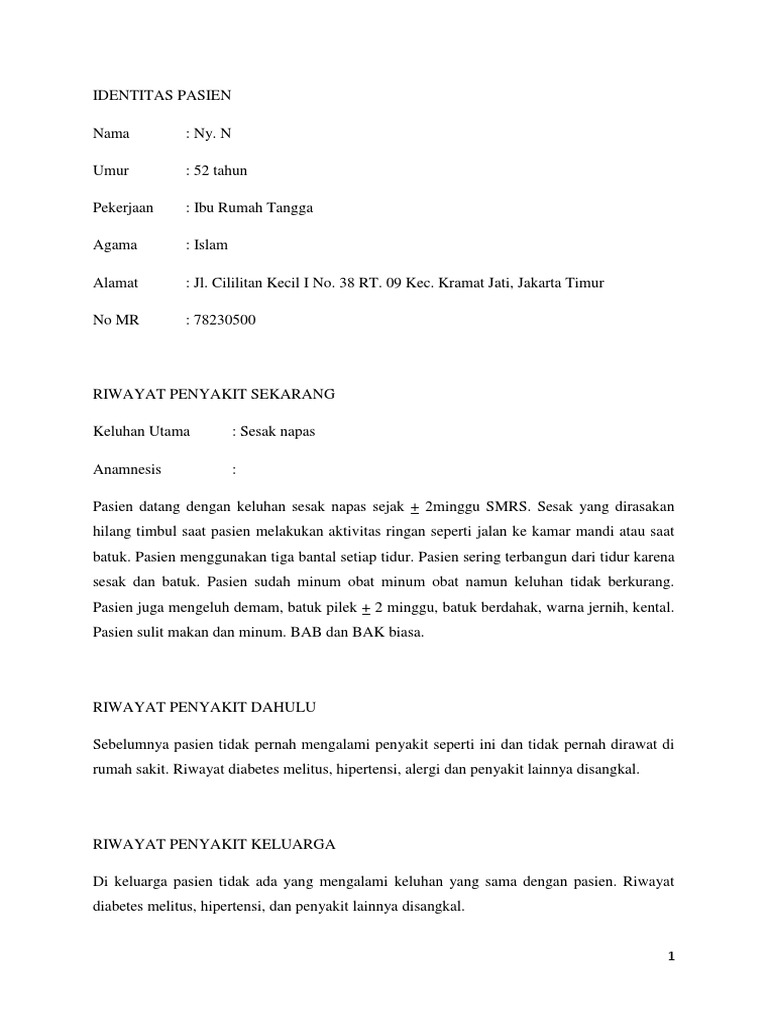 Pasien datang dengan keluhan sesak napas sejak + 2minggu SMRS. Sesak yang dirasakan hilang timbul saat pasien melakukan aktivitas ringan seperti jalan ke kamar mandi atau saat batuk. Pasien menggunakan tiga bantal setiap tidur. Pasien sering terbangun dari tidur karena sesak dan batuk. Pasien sudah minum obat minum obat namun keluhan tidak berkurang. Pasien juga mengeluh demam, batuk pilek + 2 minggu, batuk berdahak, warna jernih, kental. Pasien sulit makan dan minum. BAB dan BAK biasa.