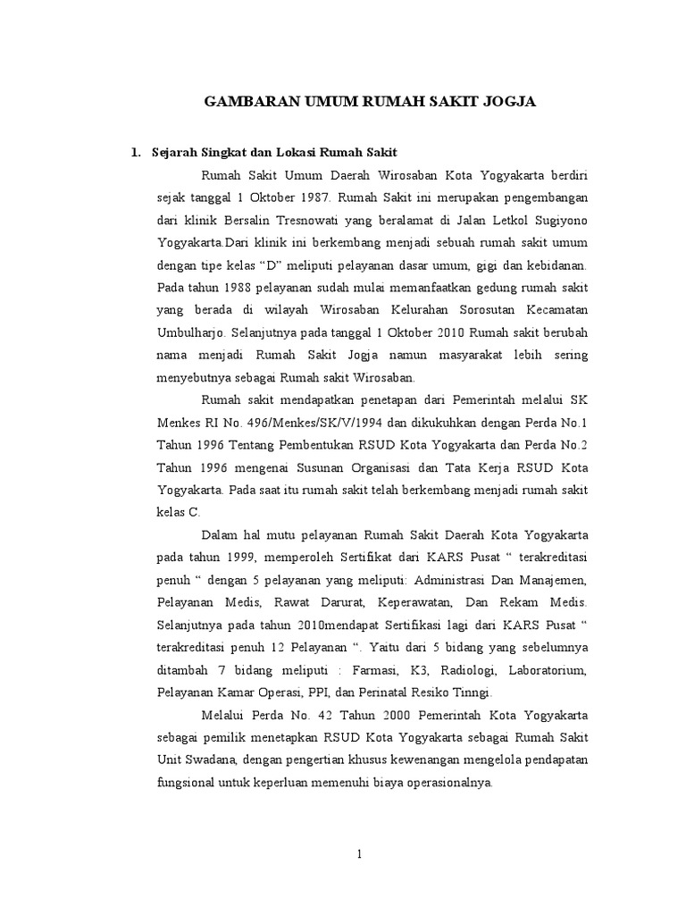1. Sejarah Singkat dan Lokasi R !ah Sakit Rumah Sakit Umum Daerah Wirosaban Kota Yogyakarta berdiri sejak tanggal 1 Oktober 1987 Rumah Sakit ini meru!akan !engembangan dari klinik "ersalin #resno$ati yang beralamat di %alan &etkol Sugiyono Yogyakarta Dari klinik ini berkembang menjadi sebuah rumah sakit umum dengan ti!e kelas 'D( meli!uti !elayanan dasar umum) gigi dan kebidanan *ada tahun 1988 !elayanan sudah mulai meman+aatkan gedung rumah sakit yang berada di $ilayah Wirosaban Kelurahan Sorosutan Ke,amatan Umbulharjo Selanjutnya !ada tanggal 1 Oktober -.1. Rumah sakit berubah nama menjadi Rumah Sakit %ogja namun masyarakat lebih sering menyebutnya sebagai Rumah sakit Wirosaban Rumah sakit menda!atkan !eneta!an dari *emerintah melalui SK /enkes R0 1o 2934/enkes4SK4541992 dan dikukuhkan dengan *erda 1o 1 #ahun 1993 #entang *embentukan RSUD Kota Yogyakarta dan *erda 1o #ahun 1993 mengenai Susunan Organisasi dan #ata Kerja RSUD Kota Yogyakarta *ada saat itu rumah sakit telah berkembang menjadi rumah sakit kelas 6 Dalam hal mutu !elayanan Rumah Sakit Daerah Kota Yogyakarta !ada tahun 1999) mem!eroleh Serti+ikat dari K7RS *usat ' terakreditasi !enuh ' dengan 8 !elayanan yang meli!uti9 7dministrasi Dan /anajemen) *elayanan /edis) Ra$at Darurat) Ke!era$atan) Dan Rekam /edis Selanjutnya !ada tahun -.1.menda!at Serti+ikasi lagi dari K7RS *usat ' terakreditasi !enuh 1- *elayanan ' Yaitu dari 8 bidang yang sebelumnya ditambah 7 bidang meli!uti 9 :armasi) K;) Radiologi) &aboratorium) *elayanan Kamar O!erasi) **0) dan *erinatal Resiko #inngi /elalui *erda 1o 2- #ahun -... *emerintah Kota Yogyakarta sebagai !emilik meneta!kan RSUD Kota Yogyakarta sebagai Rumah Sakit Unit S$adana) dengan !engertian khusus ke$enangan mengelola !enda!atan +ungsional untuk ke!erluan memenuhi biaya o!erasionalnya