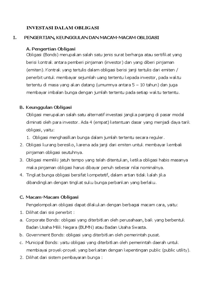 I. PENGERTIAN, KEUNGGULAN DAN MACAM-MACAM OBLIGASI A. Pengertian Obligasi Obligasi (Bonds) merupakan salah satu jenis surat berharga atau sertifikat yang berisi kontrak antara pemberi pinjaman (investor) dan yang diberi pinjaman (emiten). Kontrak yang tertulis dalam obligasi berisi janji tertulis dari emiten / penerbit untuk membayar sejumlah uang tertentu kepada investor, pada waktu tertentu di masa yang akan datang (umumnya antara 5 10 tahun) dan juga membayar imbalan bunga dengan jumlah tertentu pada setiap waktu tertentu. B. Keunggulan Obligasi Obligasi merupakan salah satu alternatif investasi jangka panjang di pasar modal diminati oleh para investor. Ada 4 (empat) ketentuan dasar yang menjadi daya tarik obligasi, yaitu: 1. Obligasi menghasilkan bunga dalam jumlah tertentu secara reguler. 2. Obligasi kurang beresiko, karena ada janji dari emiten untuk membayar kembali pinjaman obligasi seutuhnya. 3. Obligasi memiliki jatuh tempo yang telah ditentukan, ketika obligasi habis masanya maka pinjaman obligasi harus dibayar penuh sebesar nilai nominalnya. 4. Tingkat bunga obligasi bersifat kompetetif, dalam artian tidak kalah jika dibandingkan dengan tingkat suku bunga perbankan yang berlaku. C. Macam-Macam Obligasi Pengelompokan obligasi dapat dilakukan dengan berbagai macam cara, yaitu: 1. Dilihat dari sisi penerbit : a. Corporate Bonds: obligasi yang diterbitkan oleh perusahaan, baik yang berbentuk Badan Usaha Milik Negara (BUMN) atau Badan Usaha Swasta. b. Government Bonds: obligasi yang diterbitkan oleh pemerintah pusat. c. Municipal Bonds: yaitu obligasi yang diterbitkan oleh pemerintah daerah untuk membiayai proyek-proyek yang berkaitan dengan kepentingan public (public utility). 2. Dilihat dari sistem pembayaran bunga :