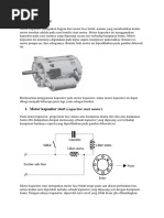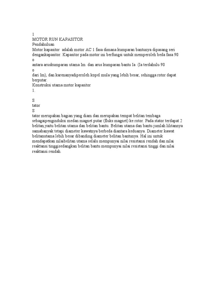 ankapasitor" Kapasitor pada motor ini berfun!si untuk memperoleh beda fasa #$ o antara aruskumparan utama Im dan arus kumparan bantu Ia %Ia terdahulu #$ o dari Im&' dan karenan adiperoleh kopel mula an! lebih besar' sehin!!a rotor dapat berputar" Konstruksi utama motor kapasitor 1" S tator S tator merupakan ba!ian an! diam dan merupakan tempat belitan temba!a seba!aipen!induksi medan ma!net putar %fluks ma!net& ke rotor" Pada stator terdapat ( belitan' aitu belitan utama dan belitan bantu" )elitan utama dan bantu *umlah lilitann a samaban ak tetapi diameter ka+atn a berbeda diantara keduan a" ,iameter ka+at belitanutama lebih besar dibandin! diameter belitan bantun a" -al ini untuk mendapatkan nilaibelitan utama selalu mempun ai nilai resistansi rendah dan nilai reaktansi tin!!isedan!kan belitan bantu mempun ai nilai resistansi tin!!i dan nilai reaktansi rendah"