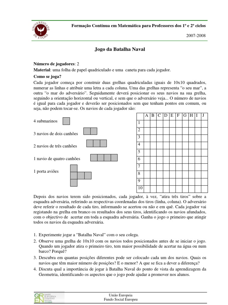 4. Discuta qual a importância de jogar à Batalha Naval do ponto de vista da aprendizagem da Geometria, identificando os aspectos que o jogo pode ajudar a promover nos alunos.
