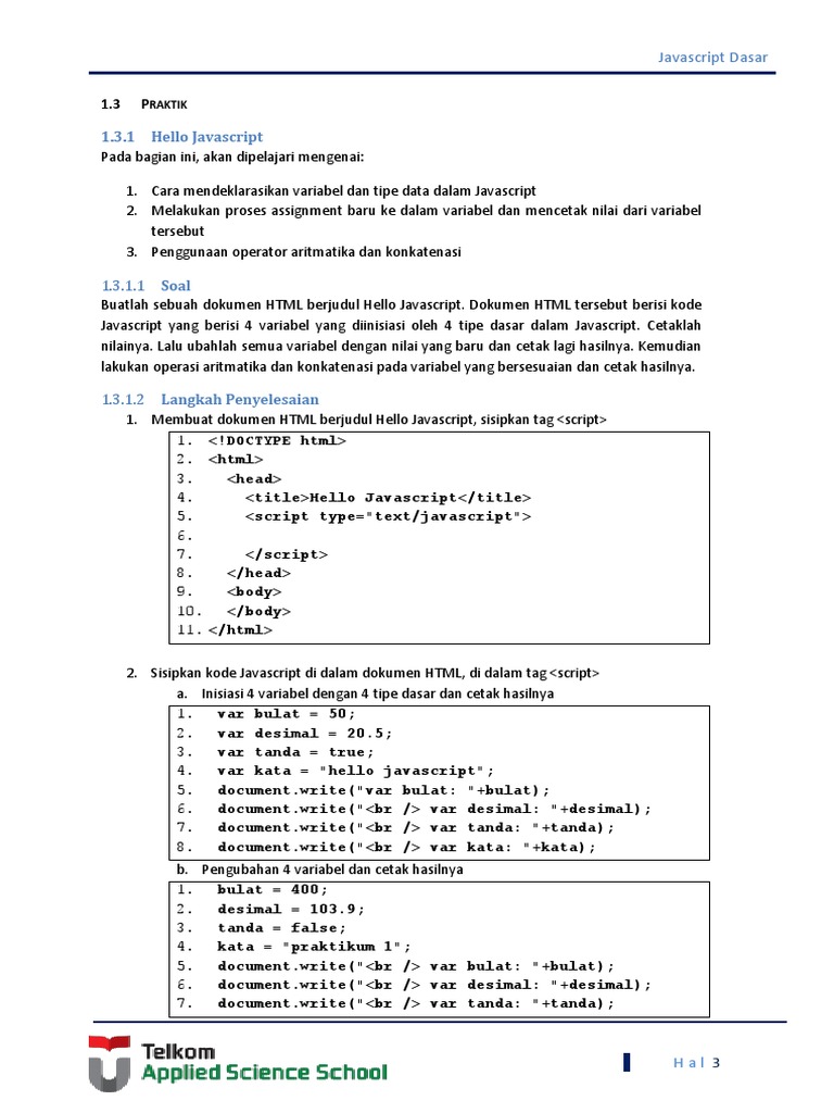 1. Membuat dokumen HTML berjudul Hello Javascript, sisipkan tag <script>