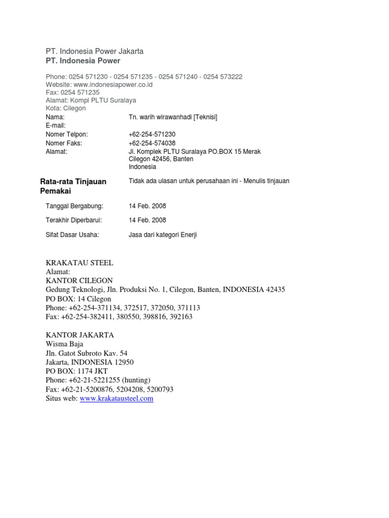 Jl. Komplek PLTU Suralaya PO.BOX 15 Merak