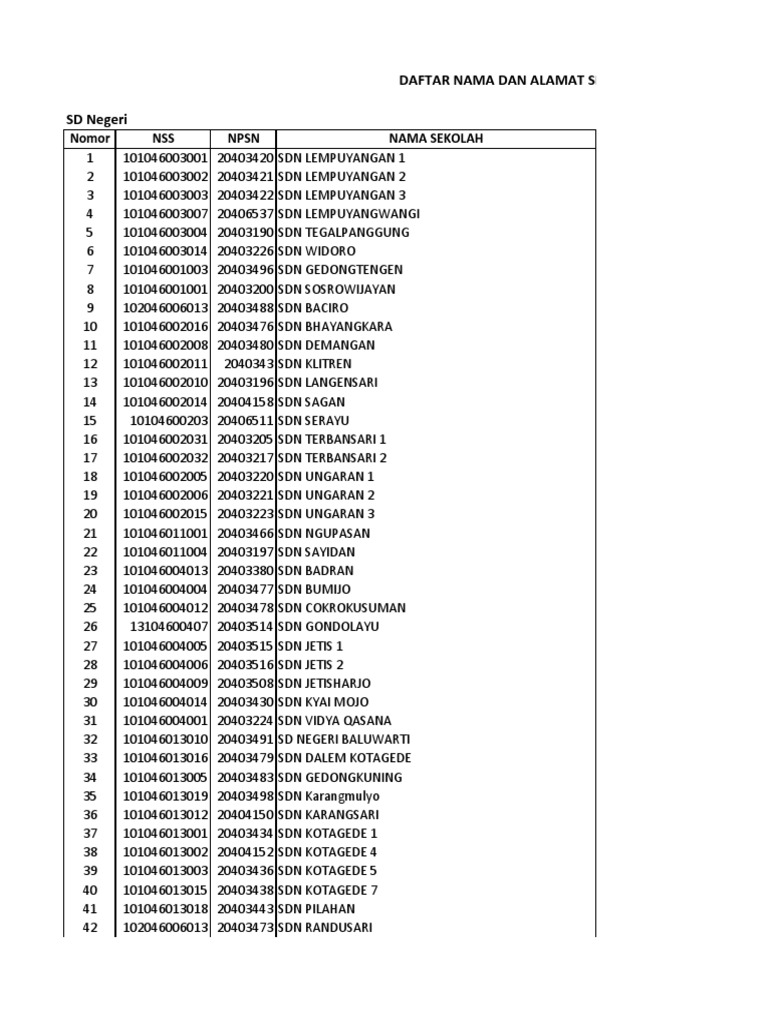 DAFTAR NAMA DAN ALAMAT SEKOLAH DASAR (SD) SSN DI KOTA YOGYAKARTA