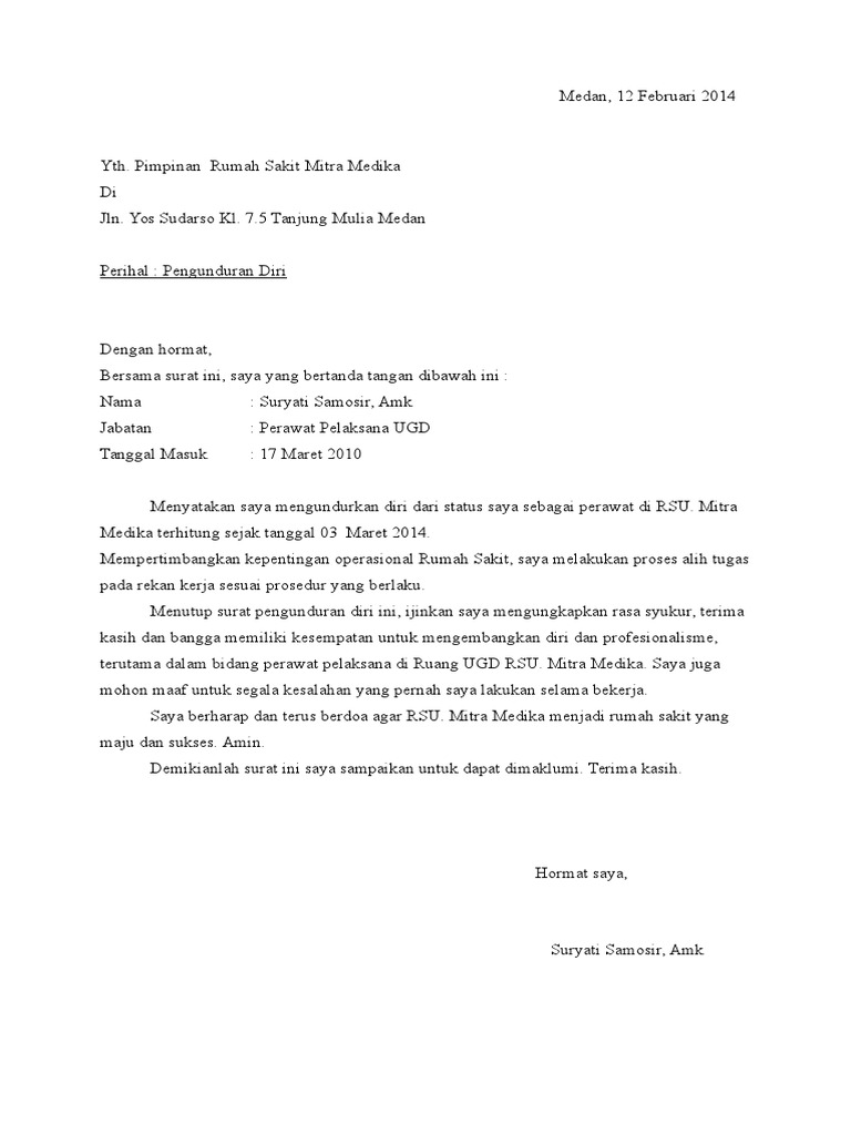 Menyatakan saya mengundurkan diri dari status saya sebagai perawat di RSU. Mitra