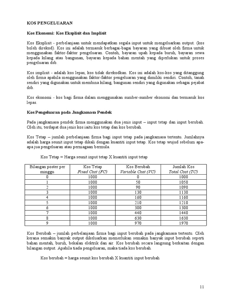 Kos Eksplisit - perbelanjaan untuk mendapatkan segala input untuk mengeluarkan output. (kos