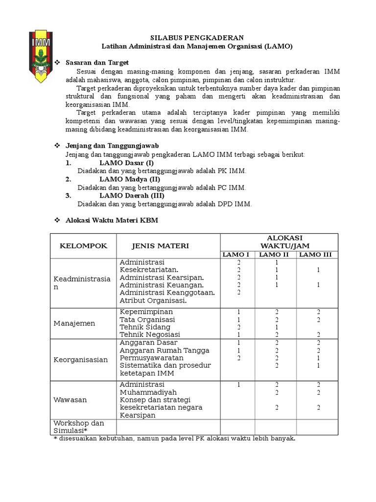 kompetensi dan wawasan yang sesuai dengan level/tingkatan kepemimpinan masingmasing dibidang keadministrasian dan keorganisasian IMM.