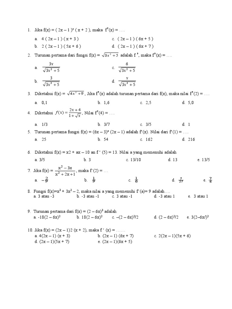 10. Jika f(x) = (2x 1)2 (x + 2), maka f (x) =