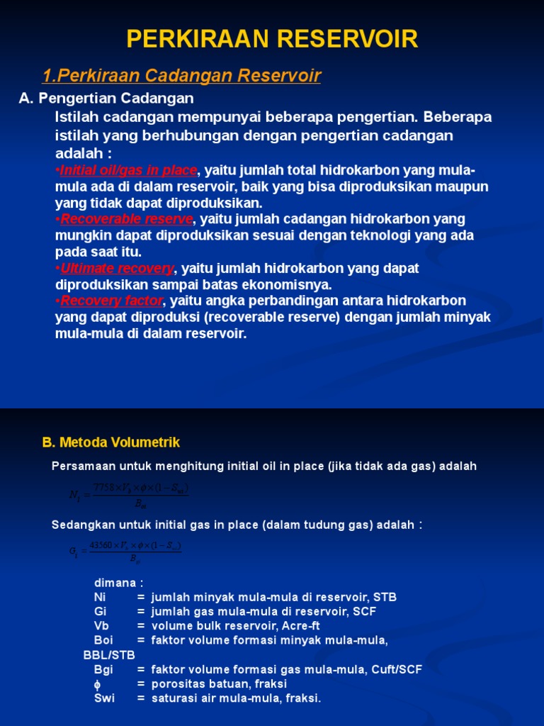 Initial oil/gas in place, yaitu jumlah total hidrokarbon yang mulamula ada di dalam reservoir, baik yang bisa diproduksikan maupun