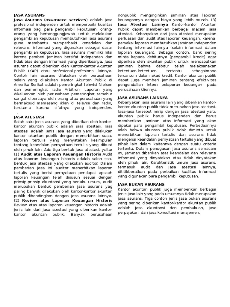 Salah satu jenis asurans yang diberikan oleh kantorkantor akuntan publik adalah jasa atestasi. Jasa