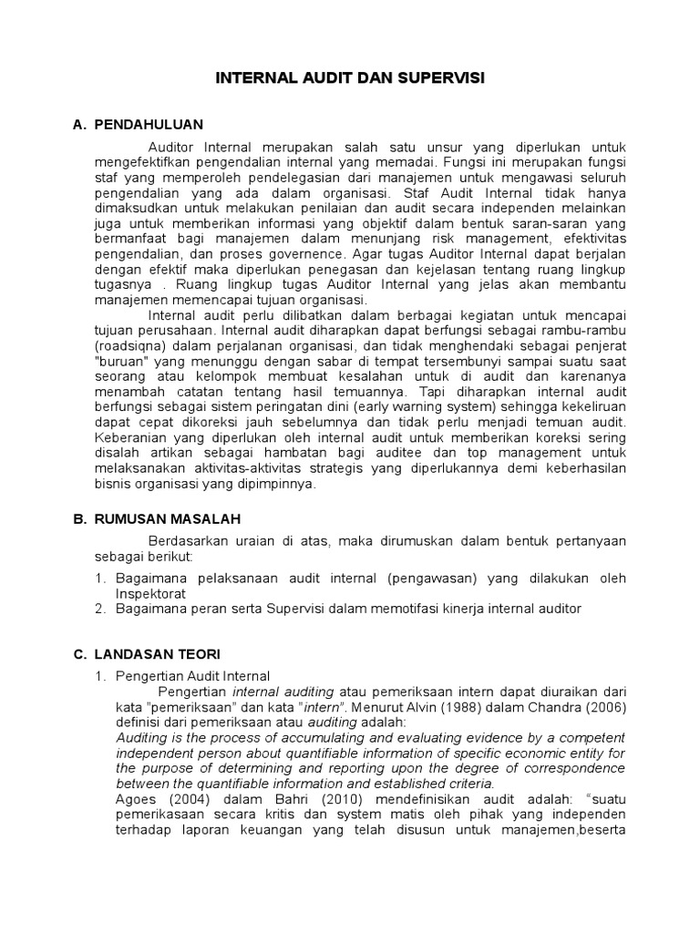 Pada internal audit pekerjaan mensupervisi dilakukan oleh Kepala Satuan
