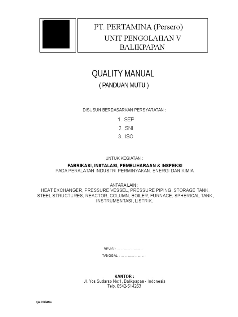 Quality Manual ini bersifat dinamis mengikuti Standard, Regulasi ataupun Code, sehingga