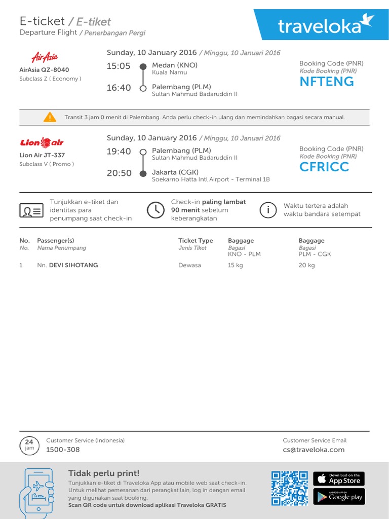 Transit 3 jam 0 menit di Palembang. Anda perlu check-in ulang dan memindahkan bagasi secara manual.