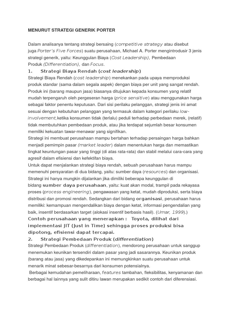 strategi generik, yaitu: Keunggulan Biaya (Cost Leadership), Pembedaan