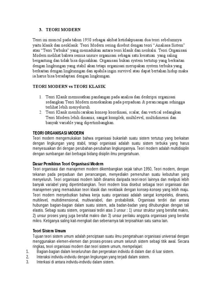 Teori modern bisa disebut sebagai teori organisasi dan manajemen umum yang