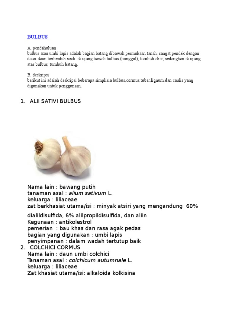 berikut ini adalah deskripsi beberapa simplisia bulbus,cormus,tuber,lignum,dan caulis yang