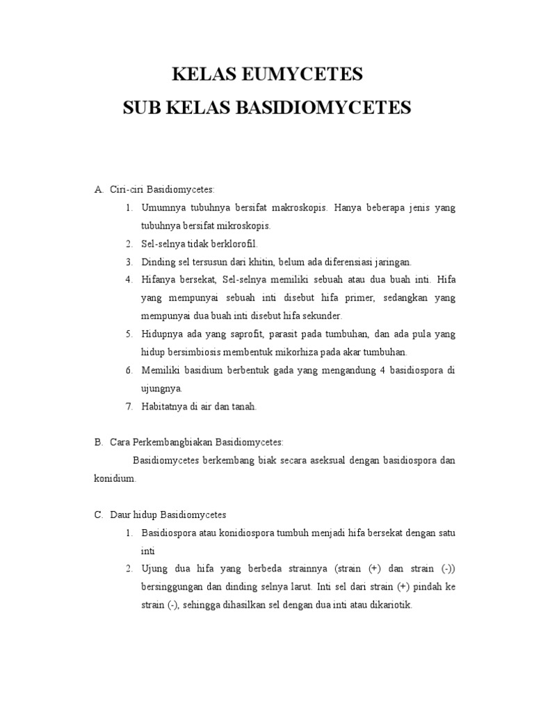 1. Holobasidiomycetes, basidium terdiri atas satu sel.