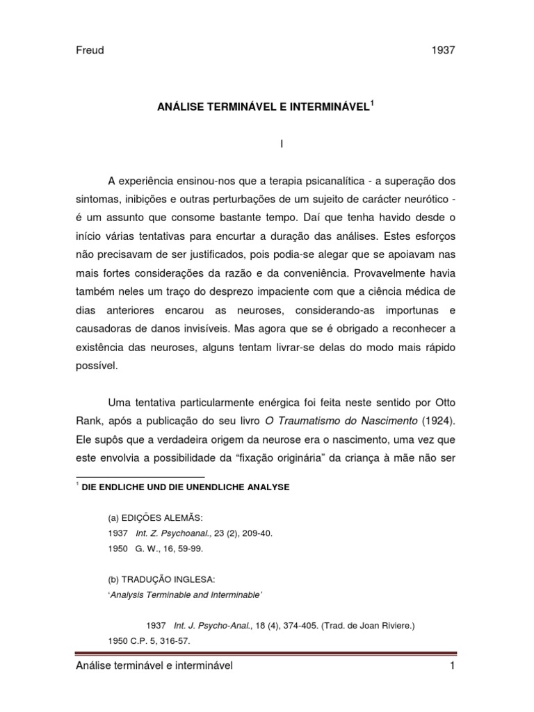 menos utilizável será para a nossa discussão. Um ponto pelo menos já se tornou claro: se quisermos atender às exigências mais rigorosas da terapia analítica. de modo mais correcto. A minha razão para escolher esses dois exemplos foi precisamente o facto de residirem tão longe no passado. Análise terminável e interminável 9 . assim como a modificação efectuada na natureza e no modo da minha actuação. visto que não dispomos de meios para predizer qual será a história posterior do restabelecimento. de início. incentivam-me a tentar responder às questões que se apresentam. e. É óbvio que quanto mais recente for o desfecho bem-sucedido de uma análise. As expectativas dos optimistas pressupõem claramente uma série de coisas que não são precisamente auto-evidentes. para fins de profilaxia. não nos obriga a restringir tão concretamente as exigências que podem ser feitas ao método terapêutico. de despertar um conflito patogénico dessa espécie que não se está revelando através de nenhuma indicação. e que é aconselhável fazê-lo. que temos o poder.Freud 1937 a sua nova doença não mostre ser uma revivificação do seu primeiro distúrbio a manifestar-se sob novas formas. que há realmente uma possibilidade de se livrar de um conflito pulsional (ou. Coloco estas questões sem me propor responder-lhes agora. de um conflito entre o ego e uma pulsão) definitivamente e para todo o sempre. nem passará por ele. em terceiro lugar. a nossa estrada não nos conduzirá a um encurtamento da sua duração. III Uma experiência analítica que se estende agora por diversas décadas. A nossa experiência. por assim dizer. que. enquanto estamos tratando alguém por causa de um determinado conflito pulsional. vaciná-lo contra a possibilidade de qualquer outro conflito deste tipo. Poder-se-á lançar alguma luz sobre o assunto mediante considerações teóricas. em segundo. Presumem. sustentarão. Talvez nem seja possível dar-lhes qualquer resposta certa. podemos.