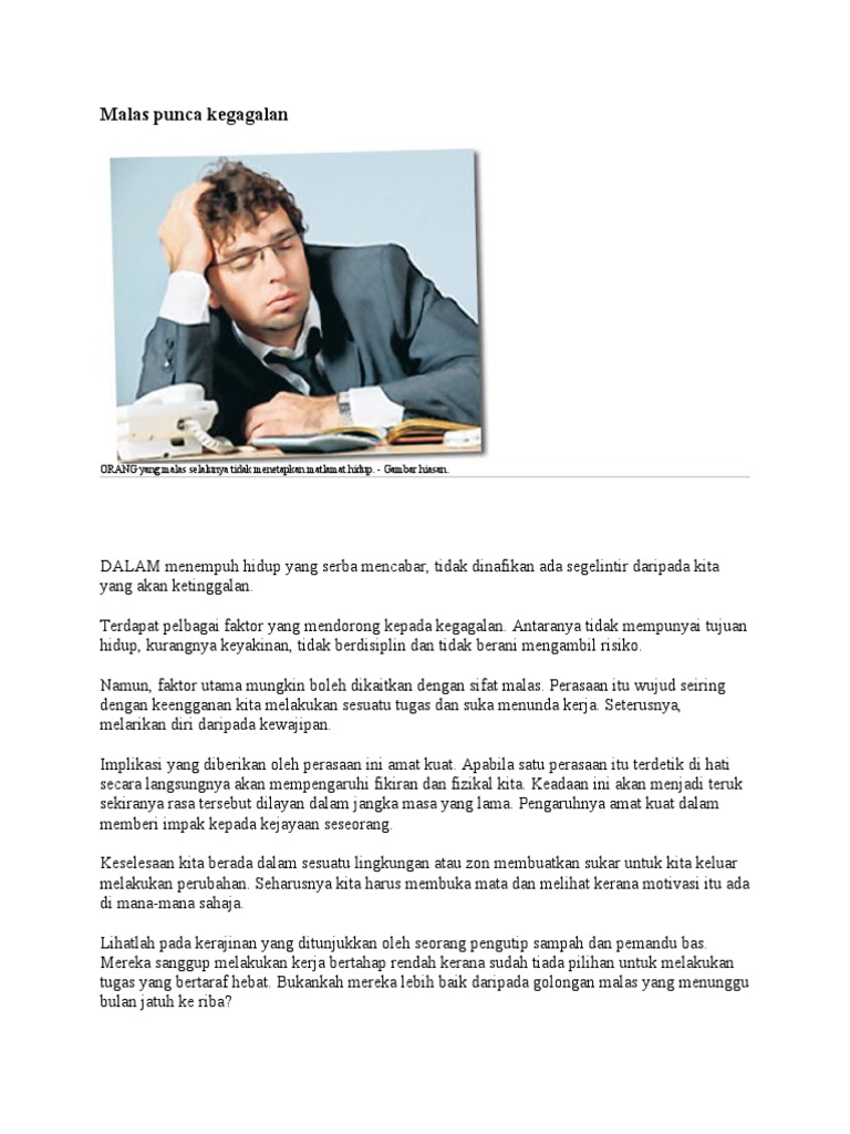 dengan keengganan kita melakukan sesuatu tugas dan suka menunda kerja. Seterusnya,