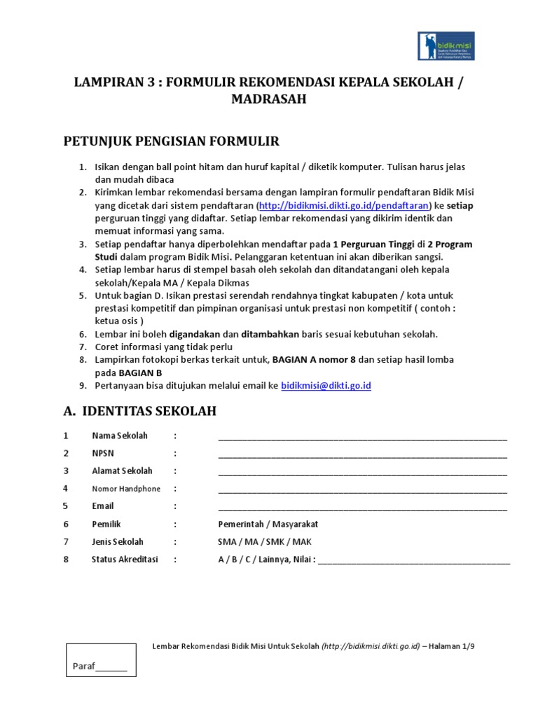 Lembar Rekomendasi Bidik Misi Untuk Sekolah (http://bidikmisi.dikti.go.id) – Halaman 1/9