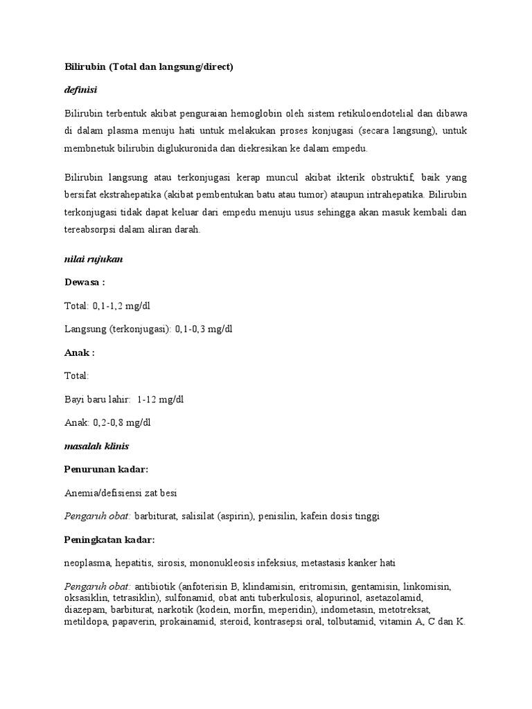 DEWASA : total : 0.1 – 1.2 mg/dl, direk : 0.1 – 0.3 mg/dl, indirek : 0.1 – 1.0 mg/dl
