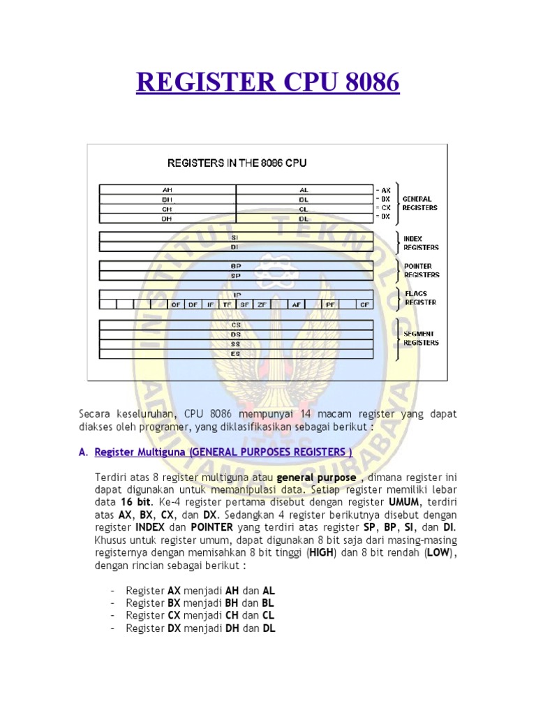 Secara keseluruhan, CPU 8086 mempunyai 14 macam register yang dapat
