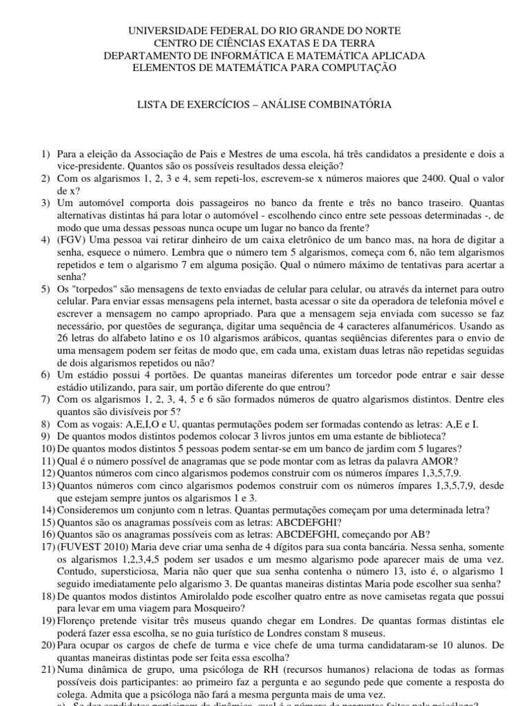 LISTA DE EXERCÍCIOS – ANÁLISE COMBINATÓRIA