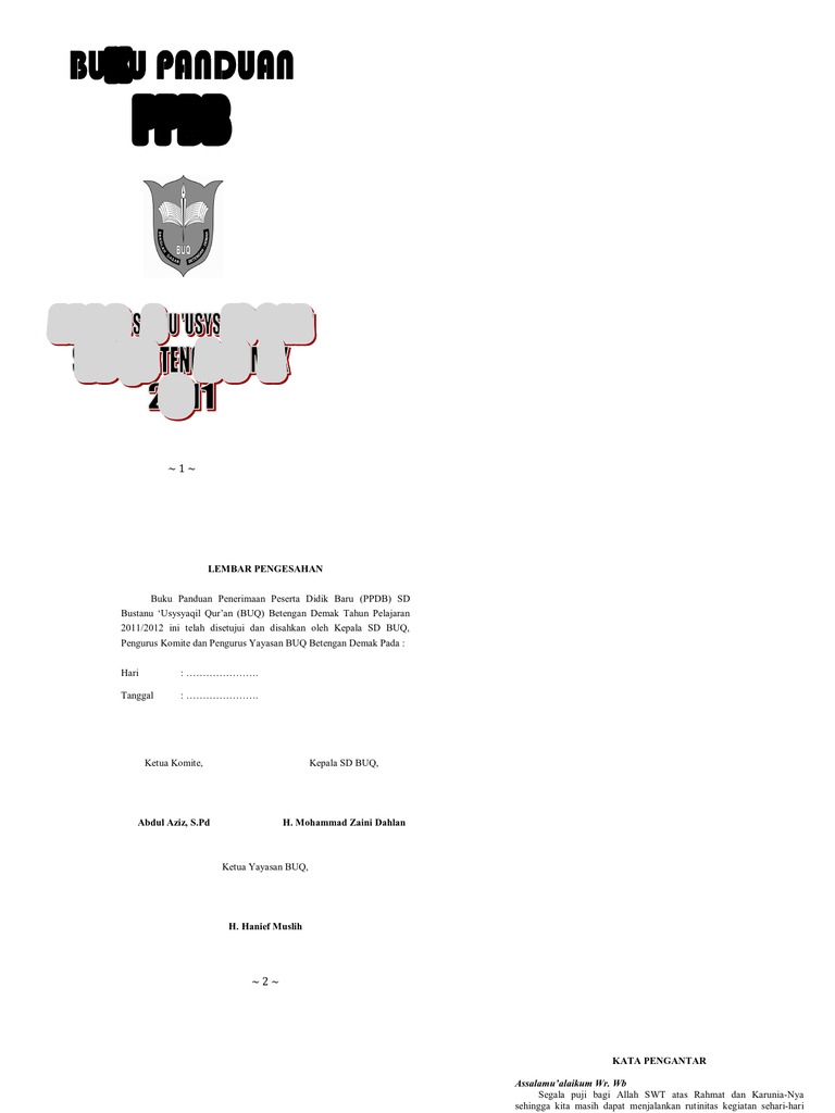 LEMBAR PENGESAHAN Buku Panduan Penerimaan Peserta Didik Baru (PPDB) SD Bustanu Usysyaqil Quran (BUQ) Betengan Demak Tahun Pelajaran 2011/2012 ini telah disetujui dan disahkan oleh Kepala SD BUQ, Pengurus Komite dan Pengurus Yayasan BUQ Betengan Demak Pada : Hari Tanggal : . : .
