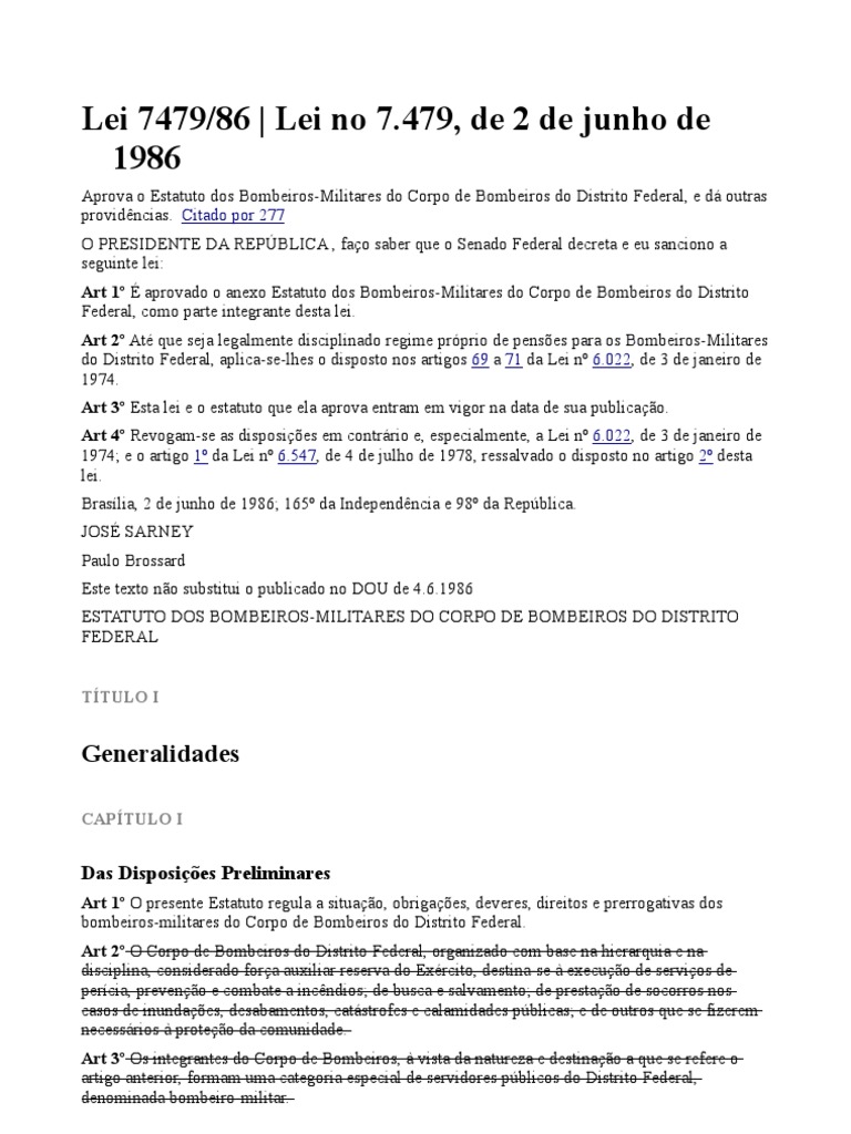 misso da Corporao. Art 5 A carreira de bombeiro-militar caracterizada pela atividade continuada e inteiramente devotada s finalidades do Corpo de Bombeiros, denominada atividade bombeiro-militar. 1 A carreira de bombeiro-militar, estruturada em graus hierrquicos, privativa de bombeiromilitar em atividade e inicia-se com o ingresso no Corpo de Bombeiros do Distrito Federal. 2 A carreira de oficial do Corpo de Bombeiros do Distrito Federal privativa de brasileiro nato. 2o A Carreira de Oficial do Corpo de Bombeiros Militar do Distrito Federal privativa de brasileiro nato ou naturalizado. (Redao dada pela Lei n 12.086, de 2009). Art 6 So equivalentes as expresses "na ativa", "da ativa", "em servio ativo", "em servio na ativa", "em servio", "em atividade", e "em atividade de bombeiro-militar", conferidas aos bombeiros-militares no desempenho de cargo, comisso, encargo, incumbncia ou misso, servio ou exerccio de funo de bombeiro-militar ou considerada de natureza de bombeiro-militar, nas Organizaes Bombeiros-Militares do Corpo de Bombeiros, bem assim em outros rgos do Governo do Distrito Federal. Art 7 A condio jurdica dos bombeiros-militares do Distrito Federal definida pelos dispositivos constitucionais que lhes forem aplicveis, pelos deste Estatuto e pelos das leis e regulamentos que lhes outorgam direitos e prerrogativas e lhes impem deveres e obrigaes. Art 8 O disposto neste Estatuto aplica-se, no que couber, aos bombeiros-militares reformados e aos da reserva remunerada. Art 9 Alm da convocao compulsria, prevista no artigo 3, letra b , n 1, deste Estatuto, os integrantes da reserva remunerada podero ainda ser, excepcionalmente, designados para o servio ativo, em carter transitrio e mediante aceitao voluntria, para servirem como assessores, instrutores e professores da Academia de Bombeiro-Militar. Pargrafo nico. A designao para o servio ativo, em carter transitrio e mediante aceitao voluntria, ser regulamentada pelo Governador do Distrito Federal. CAPTULO II