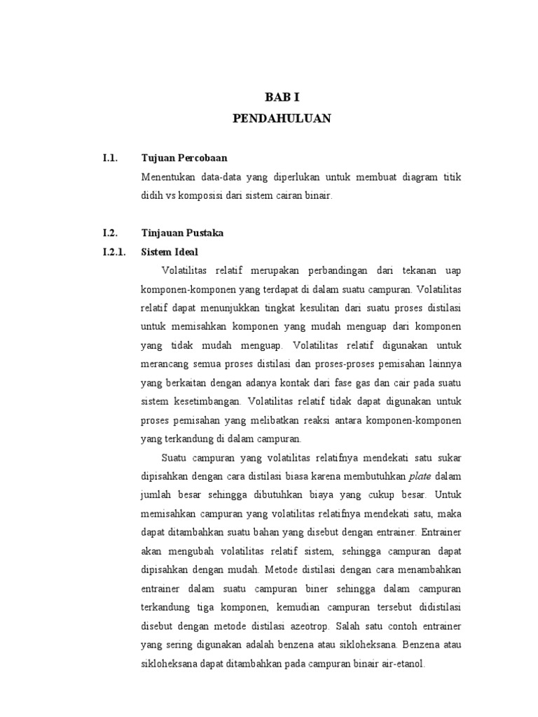 I.1. Tujuan Percobaan Menentukan data-data yang diperlukan untuk membuat diagram titik didih vs komposisi dari sistem cairan binair. I.2. I.2.1. Tinjauan Pustaka Sistem Ideal Volatilitas relatif merupakan perbandingan dari tekanan uap komponen-komponen yang terdapat di dalam suatu campuran. Volatilitas relatif dapat menunjukkan tingkat kesulitan dari suatu proses distilasi untuk memisahkan komponen yang mudah menguap dari komponen yang tidak mudah menguap. Volatilitas relatif digunakan untuk merancang semua proses distilasi dan proses-proses pemisahan lainnya yang berkaitan dengan adanya kontak dari fase gas dan cair pada suatu sistem kesetimbangan. Volatilitas relatif tidak dapat digunakan untuk proses pemisahan yang melibatkan reaksi antara komponen-komponen yang terkandung di dalam campuran. Suatu campuran yang volatilitas relatifnya mendekati satu sukar dipisahkan dengan cara distilasi biasa karena membutuhkan plate dalam jumlah besar sehingga dibutuhkan biaya yang cukup besar. Untuk memisahkan campuran yang volatilitas relatifnya mendekati satu, maka dapat ditambahkan suatu bahan yang disebut dengan entrainer. Entrainer akan mengubah volatilitas relatif sistem, sehingga campuran dapat dipisahkan dengan mudah. Metode distilasi dengan cara menambahkan entrainer dalam suatu campuran biner sehingga dalam campuran terkandung tiga komponen, kemudian campuran tersebut didistilasi disebut dengan metode distilasi azeotrop. Salah satu contoh entrainer yang sering digunakan adalah benzena atau sikloheksana. Benzena atau sikloheksana dapat ditambahkan pada campuran binair air-etanol.