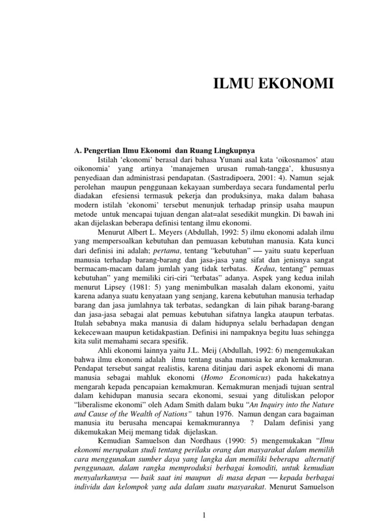 A. Pengertian Ilmu Ekonomi dan Ruang Lingkupnya Istilah ekonomi berasal dari bahasa Yunani asal kata oikosnamos atau oikonomia yang artinya manajemen urusan rumah-tangga, khususnya penyediaan dan administrasi pendapatan. (Sastradipoera, 2001: 4). Namun sejak perolehan maupun penggunaan kekayaan sumberdaya secara fundamental perlu diadakan efesiensi termasuk pekerja dan produksinya, maka dalam bahasa modern istilah ekonomi tersebut menunjuk terhadap prinsip usaha maupun metode untuk mencapai tujuan dengan alat=alat sesedikit mungkin. Di bawah ini akan dijelaskan beberapa definisi tentang ilmu ekonomi. Menurut Albert L. Meyers (Abdullah, 1992: 5) ilmu ekonomi adalah ilmu yang mempersoalkan kebutuhan dan pemuasan kebutuhan manusia. Kata kunci dari definisi ini adalah; pertama, tentang kebutuhan yaitu suatu keperluan manusia terhadap barang-barang dan jasa-jasa yang sifat dan jenisnya sangat bermacam-macam dalam jumlah yang tidak terbatas. Kedua, tentang pemuas kebutuhan yang memiliki ciri-ciri terbatas adanya. Aspek yang kedua inilah menurut Lipsey (1981: 5) yang menimbulkan masalah dalam ekonomi, yaitu karena adanya suatu kenyataan yang senjang, karena kebutuhan manusia terhadap barang dan jasa jumlahnya tak terbatas, sedangkan di lain pihak barang-barang dan jasa-jasa sebagai alat pemuas kebutuhan sifatnya langka ataupun terbatas. Itulah sebabnya maka manusia di dalam hidupnya selalu berhadapan dengan kekecewaan maupun ketidakpastian. Definisi ini nampaknya begitu luas sehingga kita sulit memahami secara spesifik. Ahli ekonomi lainnya yaitu J.L. Meij (Abdullah, 1992: 6) mengemukakan bahwa ilmu ekonomi adalah ilmu tentang usaha manusia ke arah kemakmuran. Pendapat tersebut sangat realistis, karena ditinjau dari aspek ekonomi di mana manusia sebagai mahluk ekonomi (Homo Economicus) pada hakekatnya mengarah kepada pencapaian kemakmuran. Kemakmuran menjadi tujuan sentral dalam kehidupan manusia secara ekonomi, sesuai yang dituliskan pelopor liberalisme ekonomi oleh Adam Smith dalam buku An Inquiry into the Nature and Cause of the Wealth of Nations tahun 1976. Namun dengan cara bagaiman manusia itu berusaha mencapai kemakmurannya ? Dalam definisi yang dikemukakan Meij memang tidak dijelaskan. Kemudian Samuelson dan Nordhaus (1990: 5) mengemukakan Ilmu ekonomi merupakan studi tentang perilaku orang dan masyarakat dalam memilih cara menggunakan sumber daya yang langka dan memiliki beberapa alternatif penggunaan, dalam rangka memproduksi berbagai komoditi, untuk kemudian menyalurkannya baik saat ini maupun di masa depan kepada berbagai individu dan kelompok yang ada dalam suatu masyarakat. Menurut Samuelson