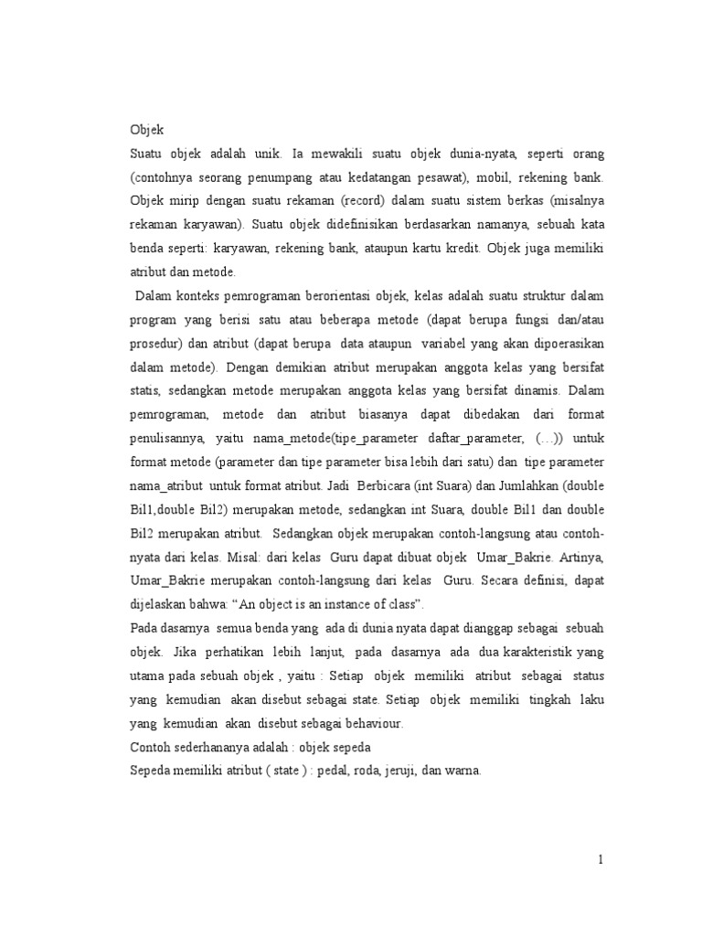 kecepatannya menurun, dan perpindahan gigi sepeda. Dalam pengembangan perangkat lunak berorientasi objek, objek dalam perangkat lunak akan menyimpan state-nya dalam variabel dan menyimpan informasi tingkah laku ( behaviour ) dalam method-method atau fungsifungsi/prosedur. Objek dalam Dunia Nyata Teknologi objek memerlukan paradigma yang membedakannya dengan sudut pandang tradisional dari pemrograman terstruktur. Dunia, selain dapat dipandang sebagai sekumpulan fungsi, dapat pula dipandang sebagai sekumpulan kelas. Orangorang, tempat, benda-benda, dan sebagainya, semuanya merupakan kelas. Contohnya, suatu bandara terdiri atas ratusan kelas yang nampak, termasuk: a. pesawat terbang b. penumpang c. bagasi Abstraksi dapat pula merupakan kelas: a. pemesanan tiket b. penundaan c. cek keamanan Meskipun tampaknya konsep ini sangat dasar, ia memberikan fondasi yang penting bagi pemahaman kelas dalam konteks komputasi. Objek dalam Model Komputasi Bisnis Objek-objek dari dunia komputasi bisnis merupakan sesuatu yang berguna secara nyata dalam lingkungan bisnis. Sebagai contoh, objek dalam perangkat lunak komputasi bisnis pada suatu bandara bisa berupa penumpang, penerbangan, landaspacu, pemesanan, dan jadwal.