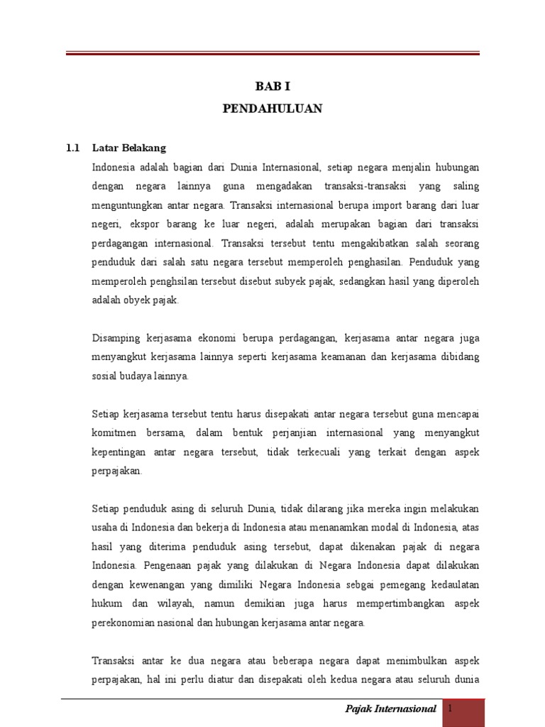 1.1 Latar Belakang Indonesia adalah bagian dari Dunia Internasional, setiap negara menjalin hubungan dengan negara lainnya guna mengadakan transaksi-transaksi yang saling menguntungkan antar negara. Transaksi internasional berupa import barang dari luar negeri, ekspor barang ke luar negeri, adalah merupakan bagian dari transaksi perdagangan internasional. Transaksi tersebut tentu mengakibatkan salah seorang penduduk dari salah satu negara tersebut memperoleh penghasilan. Penduduk yang memperoleh penghsilan tersebut disebut subyek pajak, sedangkan hasil yang diperoleh adalah obyek pajak. Disamping kerjasama ekonomi berupa perdagangan, kerjasama antar negara juga menyangkut kerjasama lainnya seperti kerjasama keamanan dan kerjasama dibidang sosial budaya lainnya. Setiap kerjasama tersebut tentu harus disepakati antar negara tersebut guna mencapai komitmen bersama, dalam bentuk perjanjian internasional yang menyangkut kepentingan antar negara tersebut, tidak terkecuali yang terkait dengan aspek perpajakan. Setiap penduduk asing di seluruh Dunia, tidak dilarang jika mereka ingin melakukan usaha di Indonesia dan bekerja di Indonesia atau menanamkan modal di Indonesia, atas hasil yang diterima penduduk asing tersebut, dapat dikenakan pajak di negara Indonesia. Pengenaan pajak yang dilakukan di Negara Indonesia dapat dilakukan dengan kewenangan yang dimiliki Negara Indonesia sebgai pemegang kedaulatan hukum dan wilayah, namun demikian juga harus mempertimbangkan aspek perekonomian nasional dan hubungan kerjasama antar negara. Transaksi antar ke dua negara atau beberapa negara dapat menimbulkan aspek perpajakan, hal ini perlu diatur dan disepakati oleh kedua negara atau seluruh dunia Pajak Internasional