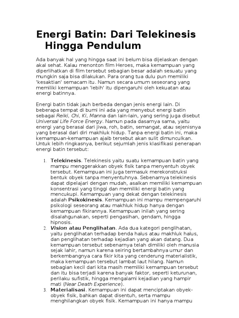 Ada banyak hal yang hingga saat ini belum bisa dijelaskan dengan akal sehat. Kalau menonton film Heroes, maka kemampuan yang diperlihatkan di film tersebut sebagian besar adalah sesuatu yang mungkin saja bisa dilakukan. Para orang tua dulu pun memiliki 'kesaktian' semacam itu. Namun secara umum seseorang yang memiliki kemampuan 'lebih' itu dipengaruhi oleh kekuatan atau energi batinnya. Energi batin tidak jauh berbeda dengan jenis energi lain. Di beberapa tempat di bumi ini ada yang menyebut energi batin sebagai Reiki, Chi, Ki, Manna dan lain-lain, yang sering juga disebut Universal Life Force Energy. Namun pada dasarnya sama, yaitu energi yang berasal dari jiwa, roh, batin, semangat, atau sejenisnya yang berasal dari diri makhluk hidup. Tanpa energi batin ini, maka kemampuan-kemampuan ajaib tersebut akan sulit dimunculkan. Untuk lebih ringkasnya, berikut sejumlah jenis klasifikasi penerapan energi batin tersebut: 1. Telekinesis. Telekinesis yaitu suatu kemampuan batin yang mampu menggerakkan obyek fisik tanpa menyentuh obyek tersebut. Kemampuan ini juga termasuk merekonstruksi bentuk obyek tanpa menyentuhnya. Sebenarnya telekinesis dapat dipelajari dengan mudah, asalkan memiliki kemampuan konsentrasi yang tinggi dan memiliki energi batin yang mencukupi. Kemampuan yang dekat dengan telekinesis adalah Psikokinesis. Kemampuan ini mampu mempengaruhi psikologi seseorang atau makhluk hidup hanya dengan kemampuan fikirannya. Kemampuan inilah yang sering disalahgunakan, seperti pengasihan, gendam, hingga hipnosis. 2. Vision atau Penglihatan. Ada dua kategori penglihatan, yaitu penglihatan terhadap benda halus atau makhluk halus, dan penglihatan terhadap kejadian yang akan datang. Dua kemampuan tersebut sebenarnya telah dimiliki oleh manusia sejak lahir, namun karena seiring bertambahnya umur dan berkembangnya cara fikir kita yang cenderung materialistik, maka kemampuan tersebut lambat laut hilang. Namun sebagian kecil dari kita masih memiliki kemampuan tersebut dan itu bisa terjadi karena banyak faktor, seperti keturunan, perilaku sufistik, hingga mengalami kejadian yang hampir mati (Near Death Experience). 3. Materialisasi. Kemampuan ini dapat menciptakan obyekobyek fisik, bahkan dapat disentuh, serta mampu menghilangkan obyek fisik. Kemampuan ini hanya mampu