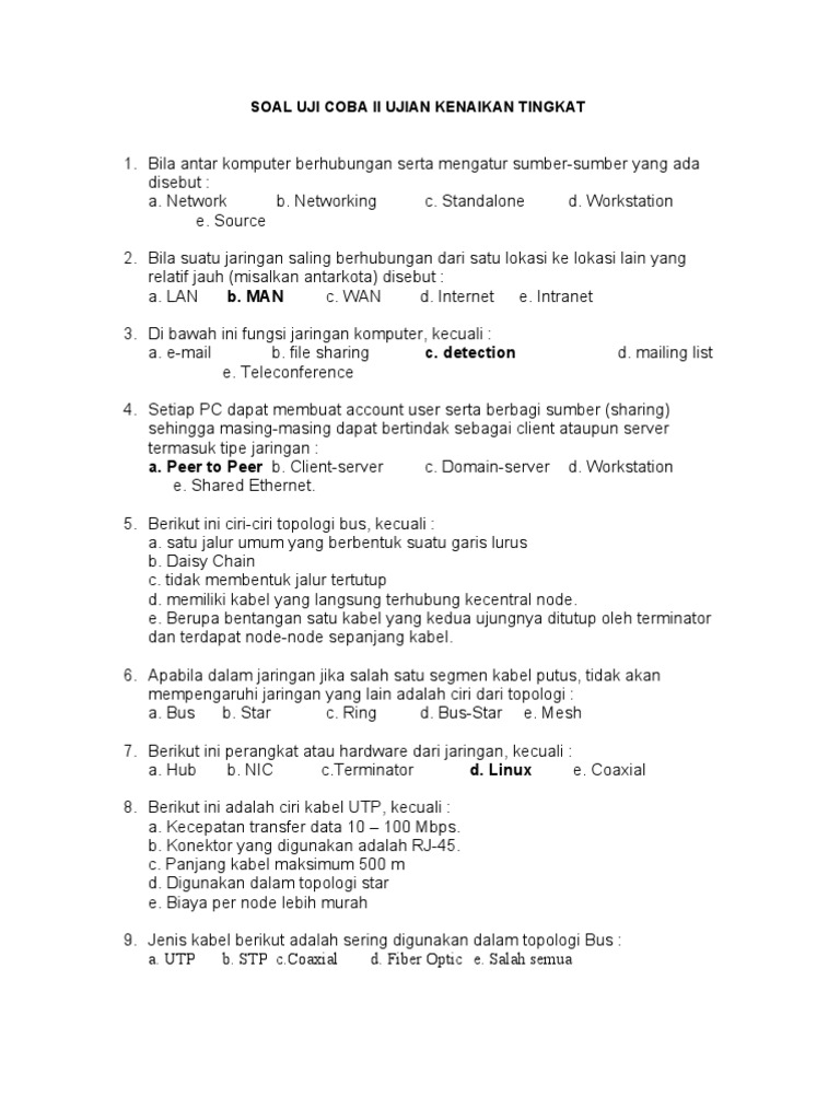 4. Setiap PC dapat membuat account user serta berbagi sumber (sharing) sehingga masing-masing dapat bertindak sebagai client ataupun server termasuk tipe jaringan : a. Peer to Peer b. Client-server c. Domain-server d. Workstation e. Shared Ethernet. 5. Berikut ini ciri-ciri topologi bus, kecuali : a. satu jalur umum yang berbentuk suatu garis lurus b. Daisy Chain c. tidak membentuk jalur tertutup d. memiliki kabel yang langsung terhubung kecentral node. e. Berupa bentangan satu kabel yang kedua ujungnya ditutup oleh terminator dan terdapat node-node sepanjang kabel. 6. Apabila dalam jaringan jika salah satu segmen kabel putus, tidak akan mempengaruhi jaringan yang lain adalah ciri dari topologi : a. Bus b. Star c. Ring d. Bus-Star e. Mesh 7. Berikut ini perangkat atau hardware dari jaringan, kecuali : a. Hub b. NIC c.Terminator d. Linux e. Coaxial 8. Berikut ini adalah ciri kabel UTP, kecuali : a. Kecepatan transfer data 10 100 Mbps. b. Konektor yang digunakan adalah RJ-45. c. Panjang kabel maksimum 500 m d. Digunakan dalam topologi star e. Biaya per node lebih murah 9. Jenis kabel berikut adalah sering digunakan dalam topologi Bus : a. UTP b. STP c.Coaxial d. Fiber Optic e. Salah semua