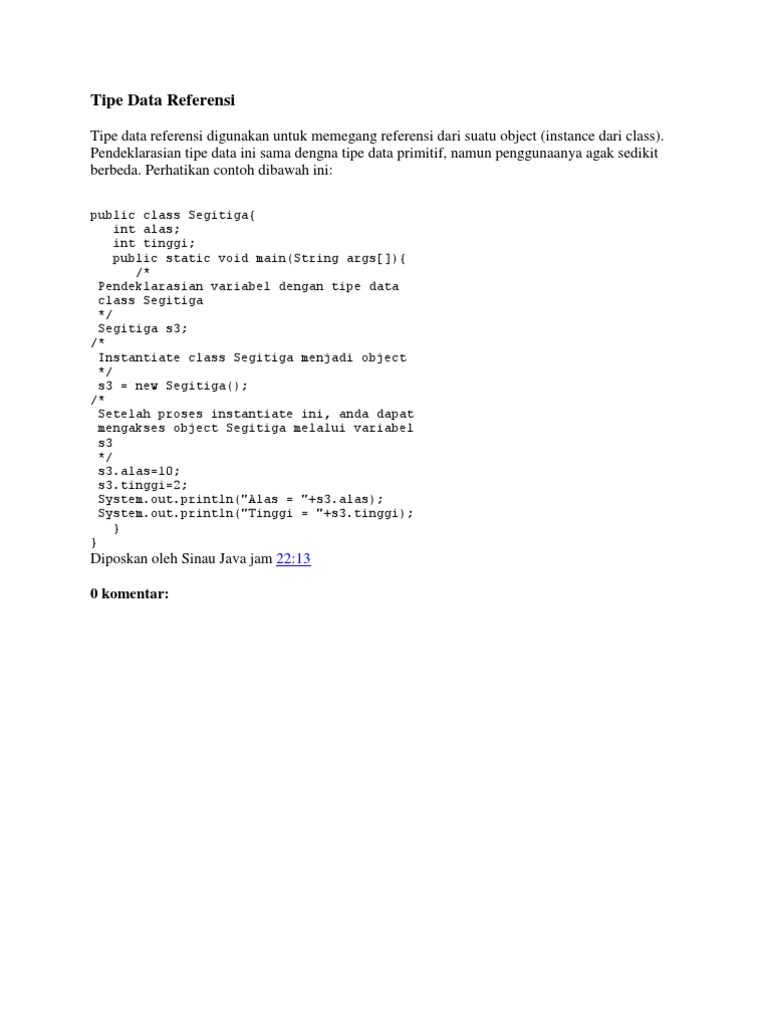 public class Segitiga{ int alas; int tinggi; public static void main(String args[]){ /* Pendeklarasian variabel dengan tipe data class Segitiga */ Segitiga s3; /* Instantiate class Segitiga menjadi object */ s3 = new Segitiga(); /* Setelah proses instantiate ini, anda dapat mengakses object Segitiga melalui variabel s3 */ s3.alas=10; s3.tinggi=2; System.out.println("Alas = "+s3.alas); System.out.println("Tinggi = "+s3.tinggi); } }
