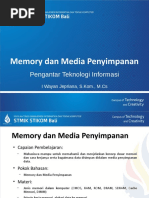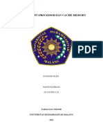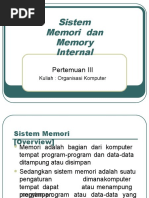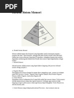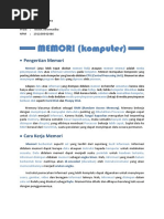 2.Chache Memory yang terdapat di luar Processor, yaitu berada pada M o t h e r B o a r d , memori jenis ini kecepatan aksesnya sangat tinggi, meskipun tidak secepat chachem e m o r i j e n i s p e r t a m a ( y a n g a d a p a d a i n t e r n a l P r o c e s s o r ) . Semakin besar kapasitasnya maka semakin mahal dan cepat. Hal ini b i s a k i t a l i h a t p a d a Motherboard dengan beraneka ragam kapasitas chace memory yaitu 256kb, 512kb,1Mb, 2Mb dll.M e m o r i u t a m a a d a l a h m e m o r i y a n g b e r f u n g s i u n t u k m e n y i m p a n d a t a d a n pro gram. Jenis Memori Utama ada 2 yaitu :1 . R O M ( R e a d O n l y m e m o r y ) y a i t u m e m o r y y a n g h a n y a b i s a dibaca saja datanya atau programnya. Pada PC, ROM terdapat pada BIOS (Basic Input Output System) yang terdapat pada Mother Board yang berfungsi untuk men-setting peripheral yang ada pada system. Contoh: AMIBIOS, AWARD BIOS, dllROM untuk BIOS terdapat beragamjenis diantaranya jenis Flash EEPROM BIOSyang memiliki kemampuan untuk dapat diganti programnya dengan software yangdisediakan oleh perusahhan pembuat Mother Board, yang umumnya penggantiantersebut untuk peningkatan unjuk kerja dari peripheral yang ada di Mother Board.2 . R A M ( R a n d o m A c c e s M e m o r y ) y a n g m e m i l i k i k e m a m p u a n untuk mengubah data atau program yang tersimpan di dalamnya. Ada bebrapa jenisR A M y a n g a d a d i p a s a r a n s a a t i n i S R A M , E D O R A M , S D R A M , D D R A M , RDRAM, VGRAM, DDR1, DDR2, dll.Pada memori jenis RAM dikenal istilah BUS SPEED, seperti PC66, PC100,PC133, PC200, PC 400 dll yang artinya adalah kecepatan aliran data atau program padamemori dimana semakin besar nilai BUS SPEED, maka semakin cepat akses terhadapmemori tersebut. Memori sekunder merupakan memori tambahan yang berfungsi untuk menyimpan data atau program. Contohnya antara lain hardisk, floppy disk dll.Bagian ketiga adalah CPU atau Central Processing Unit. Pada PC atau personalkomputer biasa disebut dengan