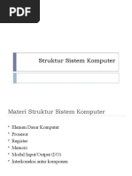 Bentuk fisik dari sebuah komputer terdiri dari tiga bagian utama yait uinput/output device, memory, dan CPU. Ketiga bagian tersebut masi n g - m a s i n g dihubungkan oleh sebuah bus yang mempunyai control unit logika tertentu. Biasanyacontrol unit tersebut terdiri dari tiga elemen penting yaitu load, clear, dan inkremen.I n p u t / o u t p u t d e v i c e d i g u n a k a n u n t u k m e n e r i m a i n p u t / m e n a m p i l k a n o u t p u t . Contoh input device adalah keyboard, mouse,scanner, microphone, dll. Contoh outputdevice adalah monitor, LCD proyektor, printer, sound speaker, dll.B a g i a n k e d u a a d a l a h m e m o r i y a n g b e r f u n g s i u n t u k m e n y i m p a n d a t a d a n program. Setiap kali pemroses melakukan eksekusi, pemroses harus membaca instruksidari memori utama. Agar instruksi dapat dilakukan secara cepat maka harus diusahakaninstruksi tersedia di memori pada hierarki berkecepatan akses lebih tinggi. Kecepatanakses ini akan meningkatkan kinerja system. Oleh karena itu terdapat konsep memori dua level yaitu ditampung terlebih dahulu pada hierarki yang lebih tinggi.Ada tiga macam memori yang penting dalam sebuah komputer yaitu register memori, cache memori, dan memori utama. Register memori merupakan jenis memoriyang memiliki kecepatan akses tinggi. Memori ini terdapat dalam sebuah CPU atau prosesor. Contoh dari memori jenis ini adalah Register Data, Register Alamat, Stack Pointer Register, Memory Addresss Register, I/O Address register, Instruction Register,dan lain-lain.Chache memori merupakan memori berkapasitas terbatas, berkecepatan tinggiyang lebih mahal daripada memori utama. Cache memory ini ada di antara memoriutama dan register pemroses, berfungsi agar pemroses tidak langsung mengacu padam e m o r i u t a m a a g a r k i n e r j a d a p a t d i t i n g k a t k a n . C a c h e M e m o r y i n i a d a d u a m a c a m yaitu:1 . C h a c h e Memory yang terdapat pada internal Processor , c hache memory jenis i n i kecepatan aksesnya sangat tinggi, dan harganya sangat mahal. Hal ini bisa terlihat pada Processor yang berharga mahal seperti P4,P3,AMD- Athlon dll, semakintinggi kapasitas L1,L2 Chace memori maka semakin mahal dan semakin cepatProcessor tersebut.