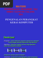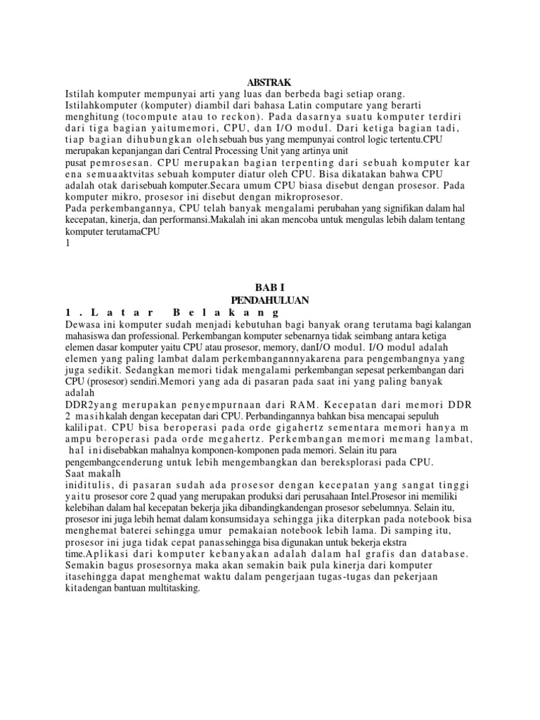Istilahkomputer (komputer) diambil dari bahasa Latin computare yang berarti menghitung (toc o m p u t e a t a u t o r e c k o n ) . P a d a d a s a r n y a s u a t u k o m p u t e r t e r d i r i dari tiga bagian yaitumemori, CPU, dan I/O modul. Dari ketiga bagian tadi, t i a p b a g i a n d i h u b u n g k a n o l e h sebuah bus yang mempunyai control logic tertentu.CPU merupakan kepanjangan dari Central Processing Unit yang artinya unit pusat p e m r o s e s a n . C P U m e r u p a k a n b a g i a n t e r p e n t i n g d a r i s e b u a h k o m p u t e r k a r e n a s e m u a aktvitas sebuah komputer diatur oleh CPU. Bisa dikatakan bahwa CPU adalah otak darisebuah komputer.Secara umum CPU biasa disebut dengan prosesor. Pada komputer mikro, prosesor ini disebut dengan mikroprosesor. Pada perkembangannya, CPU telah banyak mengalami perubahan yang signifikan dalam hal kecepatan, kinerja, dan performansi.Makalah ini akan mencoba untuk mengulas lebih dalam tentang komputer terutamaCPU 1