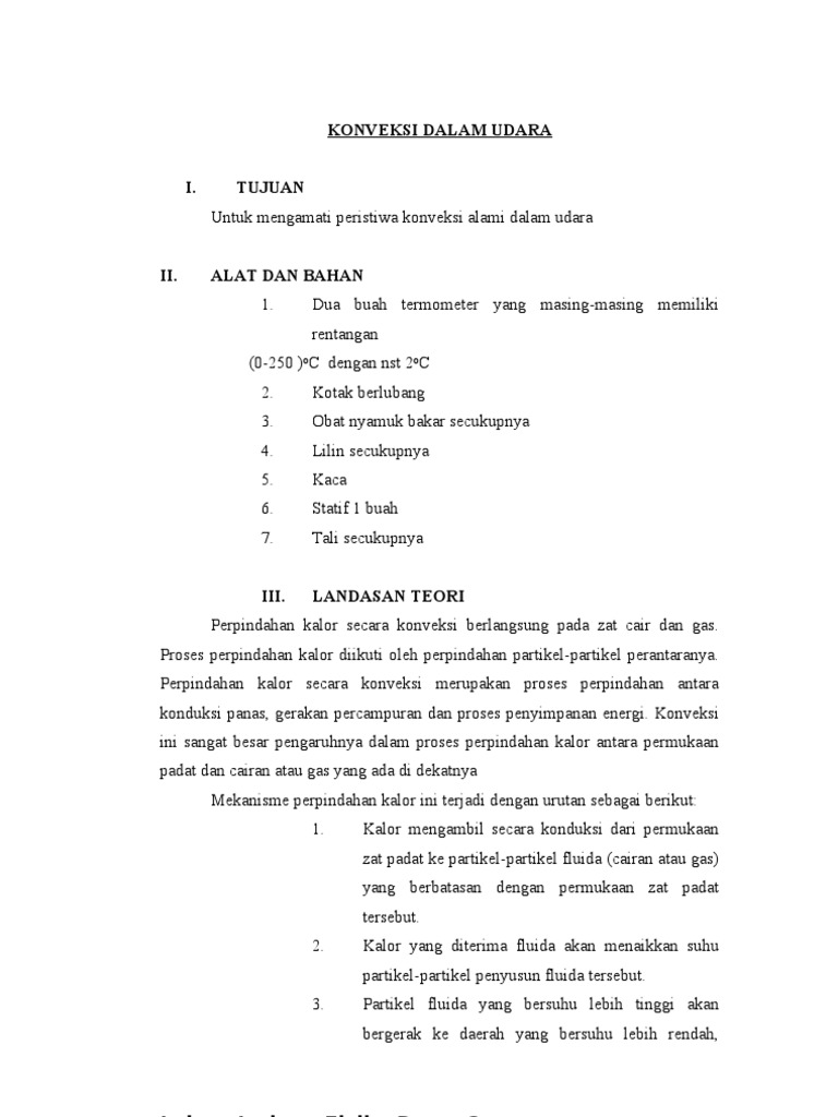 setelah beberapa waktu akan turun. 2. Adanya kebocoran dari kotak konveksi yang digunakan sehingga suhu kotak dipengaruhi oleh suhu lingkungan. IX. JAWABAN PERTANYAAN 1. Udara yang bersuhu lebih tinggi adalah udara pada lubang yang di bawahnya terdapat lilin (lubang 1). Sedangkan pada lubang 2 memiliki suhu yang lebih rendah. Hal ini disebabkan oleh suhu yang ditimbulkan oleh lilin lebih besar. 2. Gerakan asap menjadi lebih cepat ketika suhu pada lubang 1 meningkat (perbedaan suhu yang terjadi antara lubang 1 dan 2 semakin lama semakin besar). Jadi disini kita dapat melihat bahwa pergerakan dari asap yang ditimbulkan oleh obat nyamuk semakin lama semakin cepat. 3. Dengan perlakuan yang berbeda diperoleh pergerakan asap yang berbeda pula, yaitu: a. Untuk lilin yang diletakkan tepat di bawah cerobong 1 pergerakan asap dari obat nyamuk semakin lama semakin cepat seiring dengan perbedaan suhu antara kedua lubang. b. Untuk lilin yang diletakkan di tengah-tengah kotak, ada sedikit asap yang masuk ke dalam lubang sehingga sangat sulit untuk melihat pola konveksi yang terjadi di dalam kotak. c. Apabila tiga buah lilin diletakkan di dalam kotak, yaitu 1 buah di tengah-tengah, dan masing-masing 1 buah di kedua lubang, maka asap tidak mau masuk ke dalam lubang.