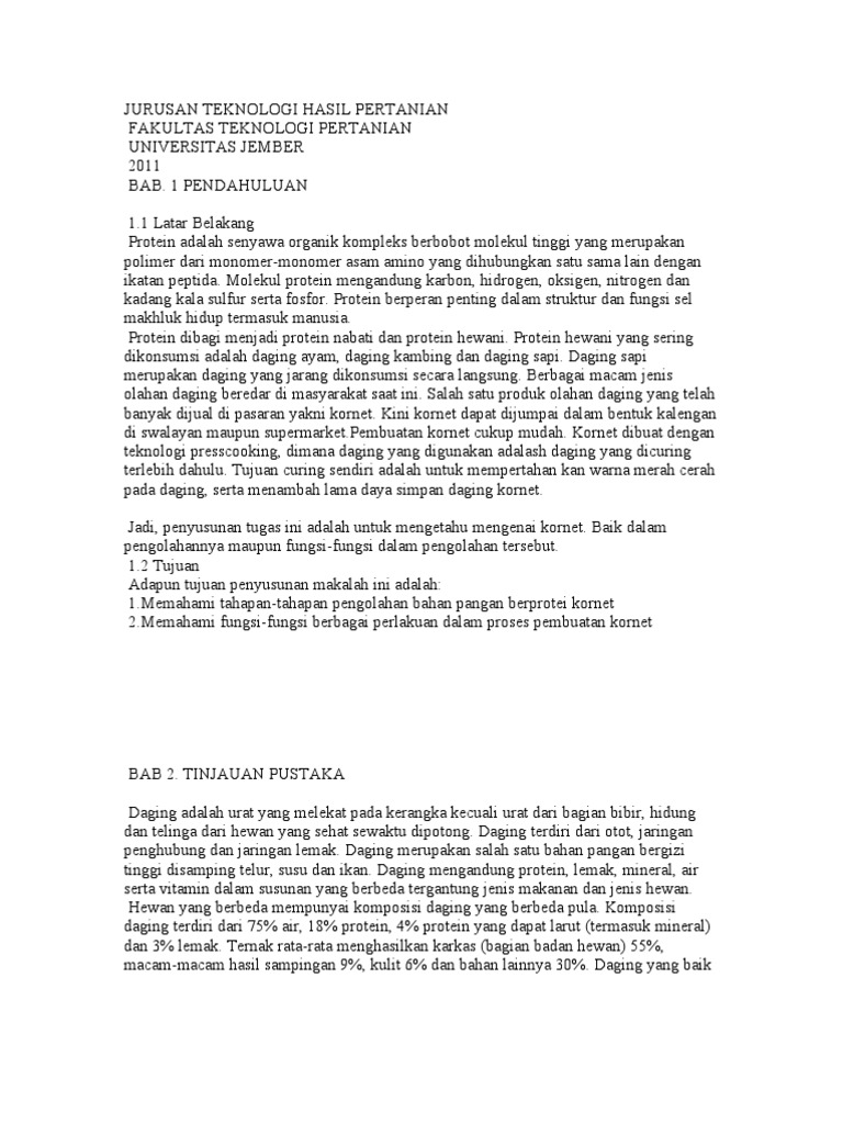 1 Latar Belakang Protein adalah senyawa organik kompleks berbobot molekul tinggi yang merupakan polimer dari monomer-monomer asam amino yang dihubungkan satu sama lain dengan ikatan peptida. Molekul protein mengandung karbon, hidrogen, oksigen, nitrogen dan kadang kala sulfur serta fosfor. Protein berperan penting dalam struktur dan fungsi sel makhluk hidup termasuk manusia. Protein dibagi menjadi protein nabati dan protein hewani. Protein hewani yang sering dikonsumsi adalah daging ayam, daging kambing dan daging sapi. Daging sapi merupakan daging yang jarang dikonsumsi secara langsung. Berbagai macam jenis olahan daging beredar di masyarakat saat ini. Salah satu produk olahan daging yang telah banyak dijual di pasaran yakni kornet. Kini kornet dapat dijumpai dalam bentuk kalengan di swalayan maupun supermarket.Pembuatan kornet cukup mudah. Kornet dibuat dengan teknologi presscooking, dimana daging yang digunakan adalash daging yang dicuring terlebih dahulu. Tujuan curing sendiri adalah untuk mempertahan kan warna merah cerah pada daging, serta menambah lama daya simpan daging kornet. Jadi, penyusunan tugas ini adalah untuk mengetahu mengenai kornet. Baik dalam pengolahannya maupun fungsi-fungsi dalam pengolahan tersebut. 1.2 Tujuan Adapun tujuan penyusunan makalah ini adalah: 1.Memahami tahapan-tahapan pengolahan bahan pangan berprotei kornet 2.Memahami fungsi-fungsi berbagai perlakuan dalam proses pembuatan kornet