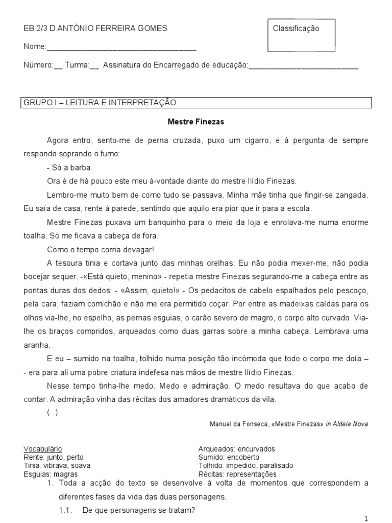 2. Que motivos tinha o narrador para considerar que ir ao barbeiro era pior que ir escola? 3. Retira do texto as caractersticas fsicas de Ildio Finezas, no esquecendo de pr em evidncia aquelas que se alteram com a passagem do tempo. 4. Enumera as principais diferenas no enquadramento social da personagem Mestre Finezas no presente. 5. Indica os espaos fsicos onde decorre a aco durante a infncia do narrador. 6. O conto constri-se sobre a alternncia temporal. Justifica esta afirmao dando exemplos de expresses que introduzem essa alternncia. 7. Classifica o narrador relativamente sua presena e sua posio face ao que conta. Justifica a tua resposta, usando expresses do texto. 8. De entre as afirmaes que se seguem, distingue as verdadeiras das falsas: a) Quando era criana, o narrador tinha medo de cortar o cabelo, porque o Mestre Finezas lhe batia com os dedos na cabea. b) Porm, o narrador admirava o Mestre Finezas por ele o levar ao teatro todas as noites. c) J adulto, o narrador, ao reencontrar o barbeiro, sente por ele uma grande ternura. d) Nas suas confidncias ao narrador, Mestre Finezas considera que a arte origina momentos de beleza inesquecveis. e) No final do texto, o narrador explica ao velho homem que ele est prestes a morrer. 8.1. Rel as afirmaes falsas e corrige-as.
