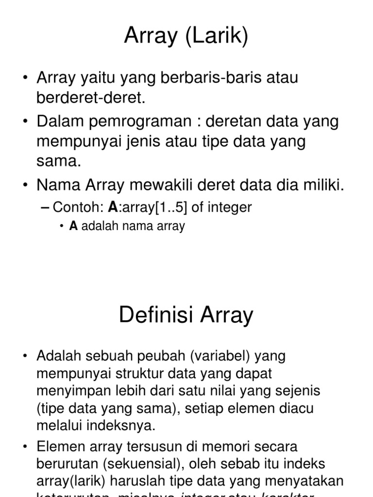 Adalah sebuah peubah (variabel) yang mempunyai struktur data yang dapat menyimpan lebih dari satu nilai yang sejenis (tipe data yang sama), setiap elemen diacu melalui indeksnya. Elemen array tersusun di memori secara berurutan (sekuensial), oleh sebab itu indeks array(larik) haruslah tipe data yang menyatakan keterurutan, misalnya integer atau karakter.