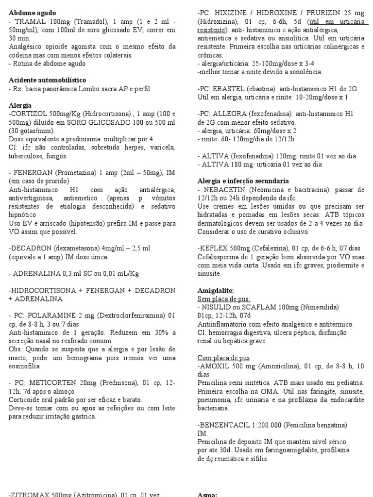 opioide agonista com o mesmo efeito da codena mas com menos efeitos colaterais - Rotina de abdome agudo Acidente automobilstico - Rx: bacia panormica Lombo sacra AP e perfil Alergia -CORTIZOL 500mg/Kg (Hidrocortisona) , 1 amp (100 e 500mg) diludo em SORO GLICOSADO 100 ou 500 ml (30 gotas/mim). Dose equivalente a predinisona: multiplicar por 4 CI: ifc no controladas, sobretudo herpes, varicela, tuberculose, fungos. - FENERGAN (Prometazina) 1 amp (2ml 50mg), IM (em caso de prurido) Anti-histaminico H1 com ao antialrgica, antivertiginosa, antiemetico (apenas p vmitos resistentes de etiologia desconhecida) e sedativo hipntico Uso EV arriscado (hipotenso) prefira IM e passe para VO assim que possvel. -DECADRON (dexametasona) 4mg/ml 2,5 ml (equivale a 1 amp) IM dose nica - ADRENALINA 0,3 ml SC ou 0,01 mL/Kg -HIDROCORTISONA + FENERGAN + DECADRON + ADRENALINA - PC: POLARAMINE 2 mg (Dextroclorfeniramina) 01 cp, de 8-8 h, 3 ou 7 dias Anti-histaminico de 1 gerao. Reduzem em 30% a secreo nasal no resfriado comum. Obs: Quando se suspeita que a alergia por leso de inseto, pedir um hemograma pois iremos ver uma eosinofilia. - PC: METICORTEN 20mg (Prednisona), 01 cp, 1212h, 7d aps o almoo Corticoide oral padro por ser eficaz e barato. Deve-se tomar com ou aps as refeies ou com leite para reduzir irritao gstrica.