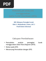 Notasi-notasi pada DFD (Edward Yourdan dan Tom DeMarco) adalah sebagai berikut : Notasi Keterangan Proses atau fungsi atau prosedur pada pemodelan perangkat lunak yang akan diimplementasikan dengan pemrograman tersruktur, maka pemodelan notasi inilah yang harusnya menjadi fungsi atau prosedur di dalam kode program. Catatan : Nama yang diberikan pada sebuah proses biasanya berupa kata kerja. File atau basis data atau penyimpanan (storage) pada pemodelan perangkat lunak yang akan diimplementasikan dengan pemograman terstruktur, maka pemodelan notasi inilah yang harusnya dibuat menjadi tabel-tabel basis data yang dibutuhkan, tabel-tabel ini juga harus sesuai dengan perancangan tabel-tabel pada basis data. (Entity Relationship Diagram (ERD), Conceptual Data Model (CDM) dan Physical Data Model (PDM)). Catatan : Nam ayang diberikan pada sebuah pemyimpanan biasanya kata benda. Entitas luar (external entity) atau masukkan (input) atau keluaran (output) atau orang yang memakai / berinteraksi dengan perangkat lunak yang dimodelkan atau sistem lain yang terkait dengan aliran data dari sistem yang dimodelkan. Catatan : Nama yang digunakan pada masukkan (input) atau keluaran (output) biasanya berupa kata benda. Notasi Keterangan Aliran data merupakan data yang dikirim antar proses, dari penyimpanan ke proses , dari penyimpanan ke proses, atau dari proses ke masukkan (input) atau keluaran (output). Catatan : Nama yang digunakan pada aliran data biasanya berupa kata benda, dapat diawali dengan dengan kata data misalnya data siswa atau tanpa kata misalnya siswa.